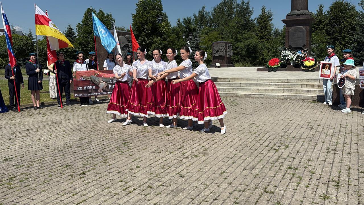 Следующим пунктом автопробега стала Стела Владикавказ – Город воинской славы. Здесь молодые участники акции «Свеча памяти» возложили цветы и свечи в виде цифры «22» к подножью Стелы, отдавая дань уважения героям, не вернувшимся с полей сражений и благодарности тем, кто дошел до Великой Победы. По завершении памятной церемонии воспитанниками Центра эстетического воспитания детей «Творчество» был дан концерт Памяти и Созидания.