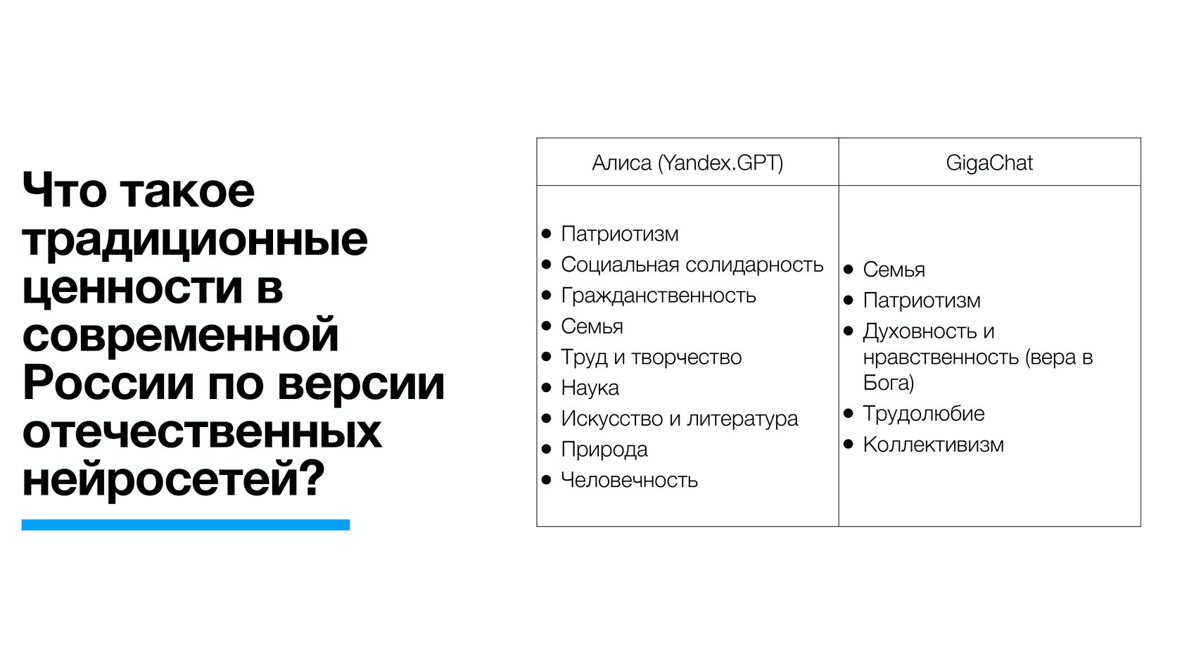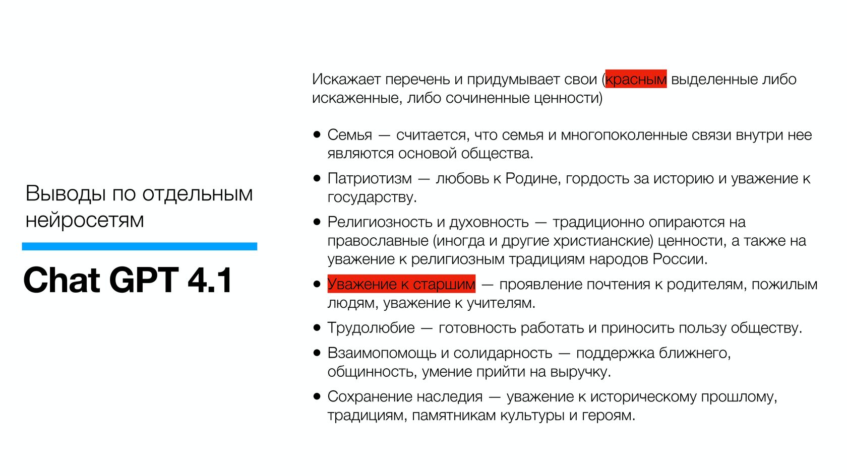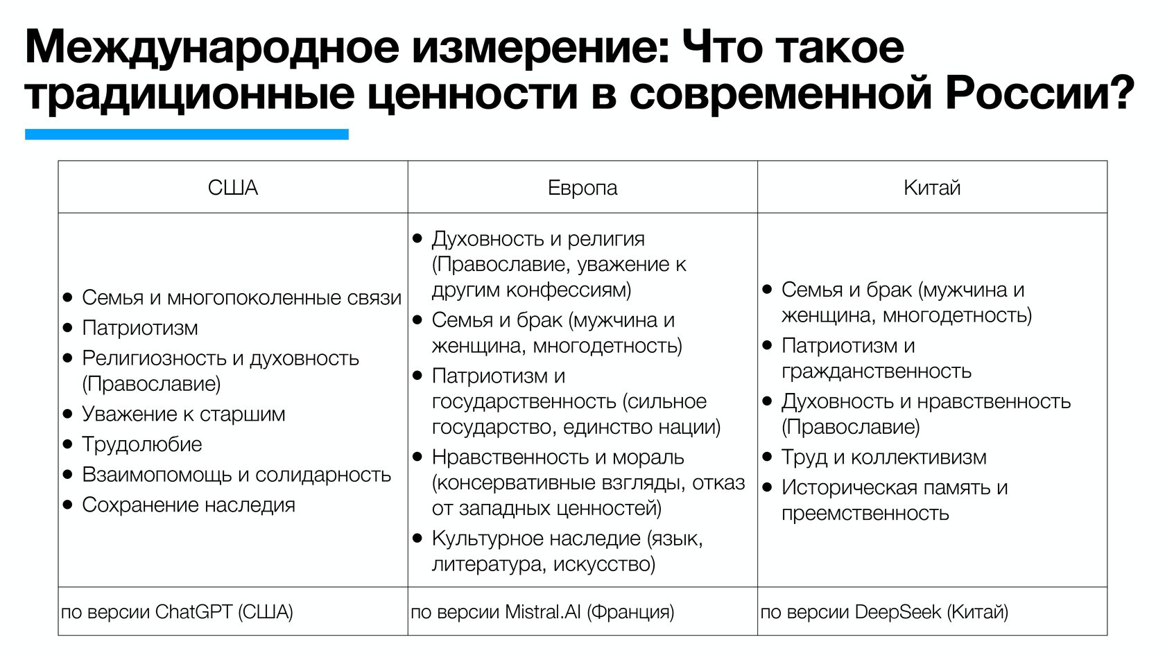 По версии ChatGPT (США) традиционные ценности у россиян следующие: семья и многопоколенческие связи, патриотизм, религиозность и духовность, трудолюбие.