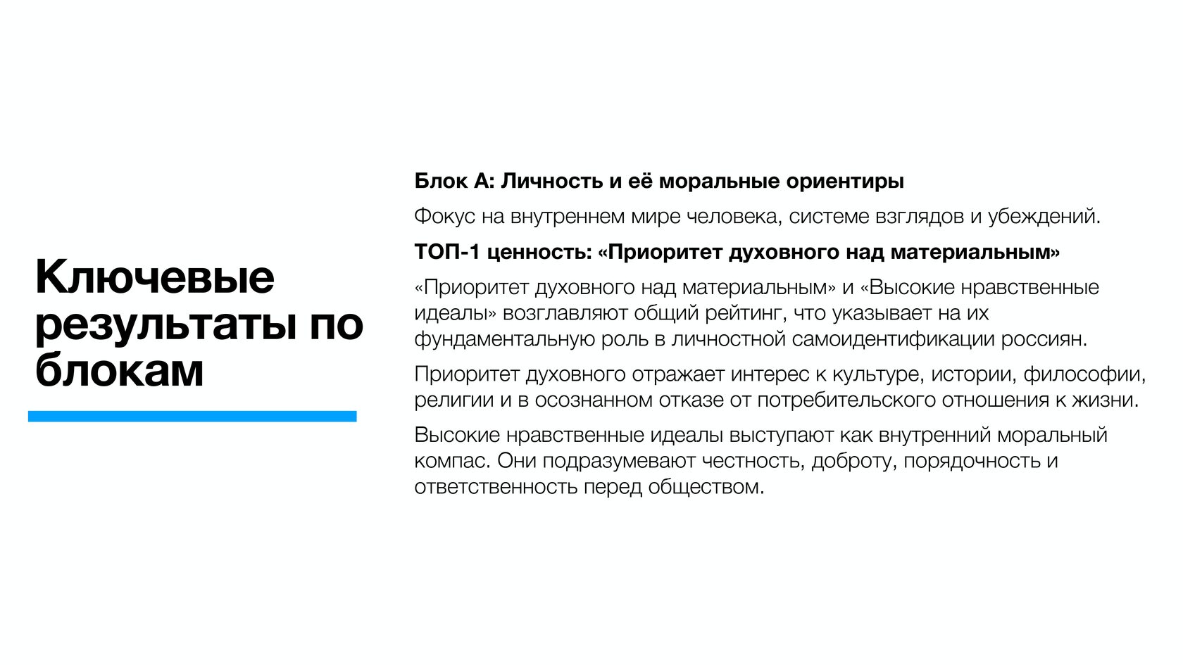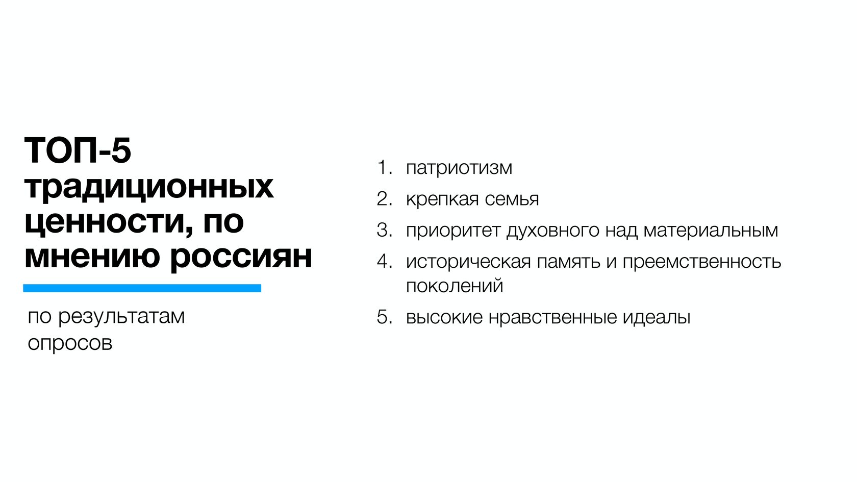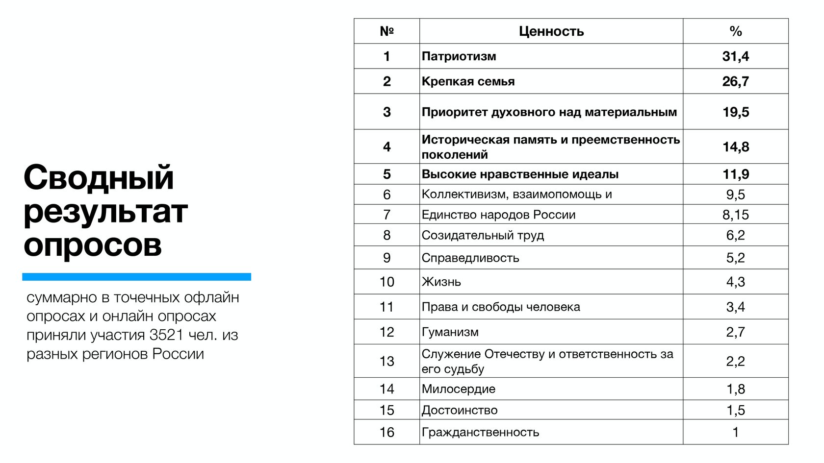 По данным опросов, патриотизм (31,4%) и крепкая семья (26,7%) являются наиболее важными ценностями для россиян. Кроме того, 19,5% видят основную ценность в приоритете духовного над материальным, 14,8% - в исторической памяти и преемственности поколений, 11,9% - в высоких нравственных идеалах.