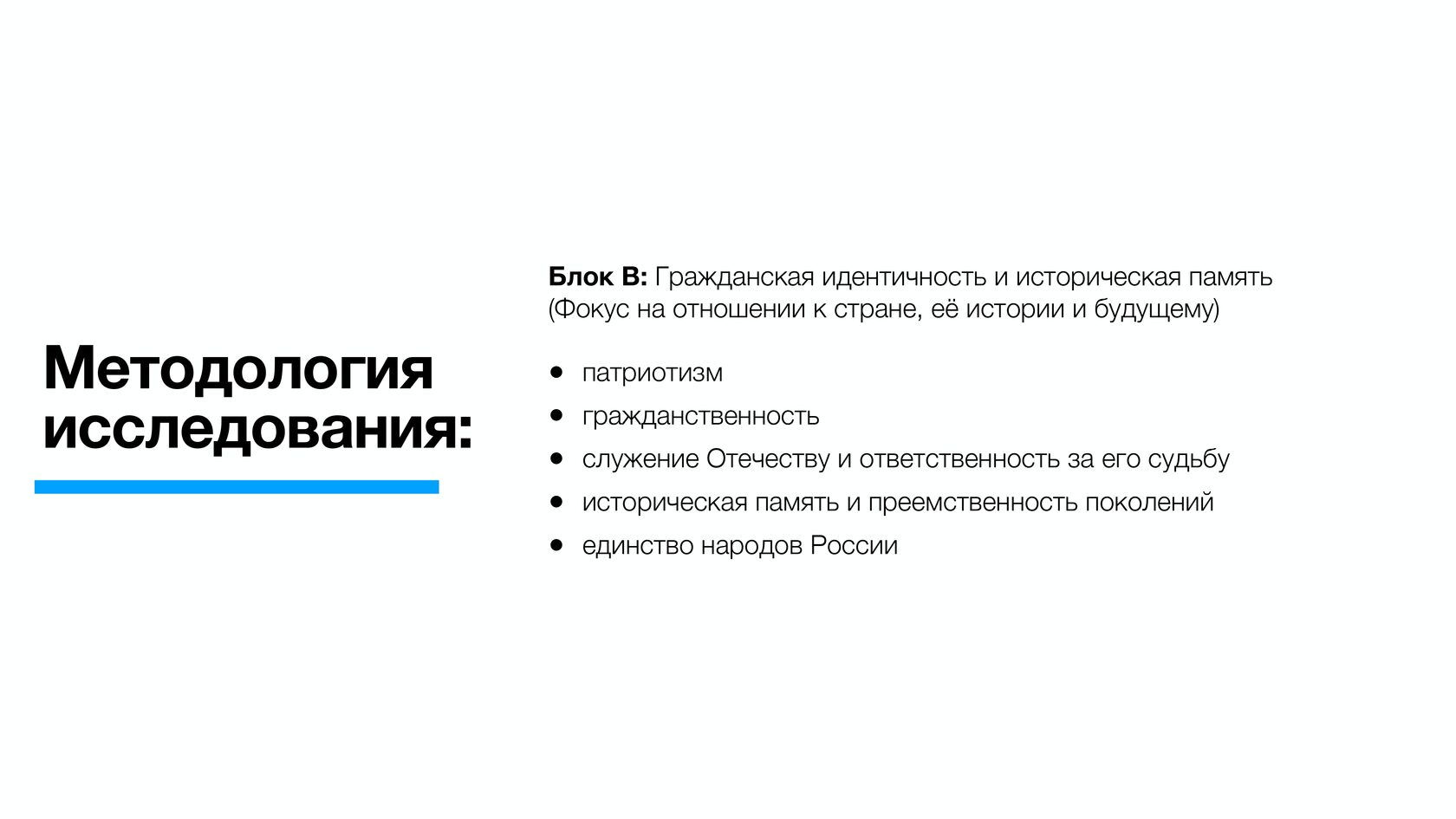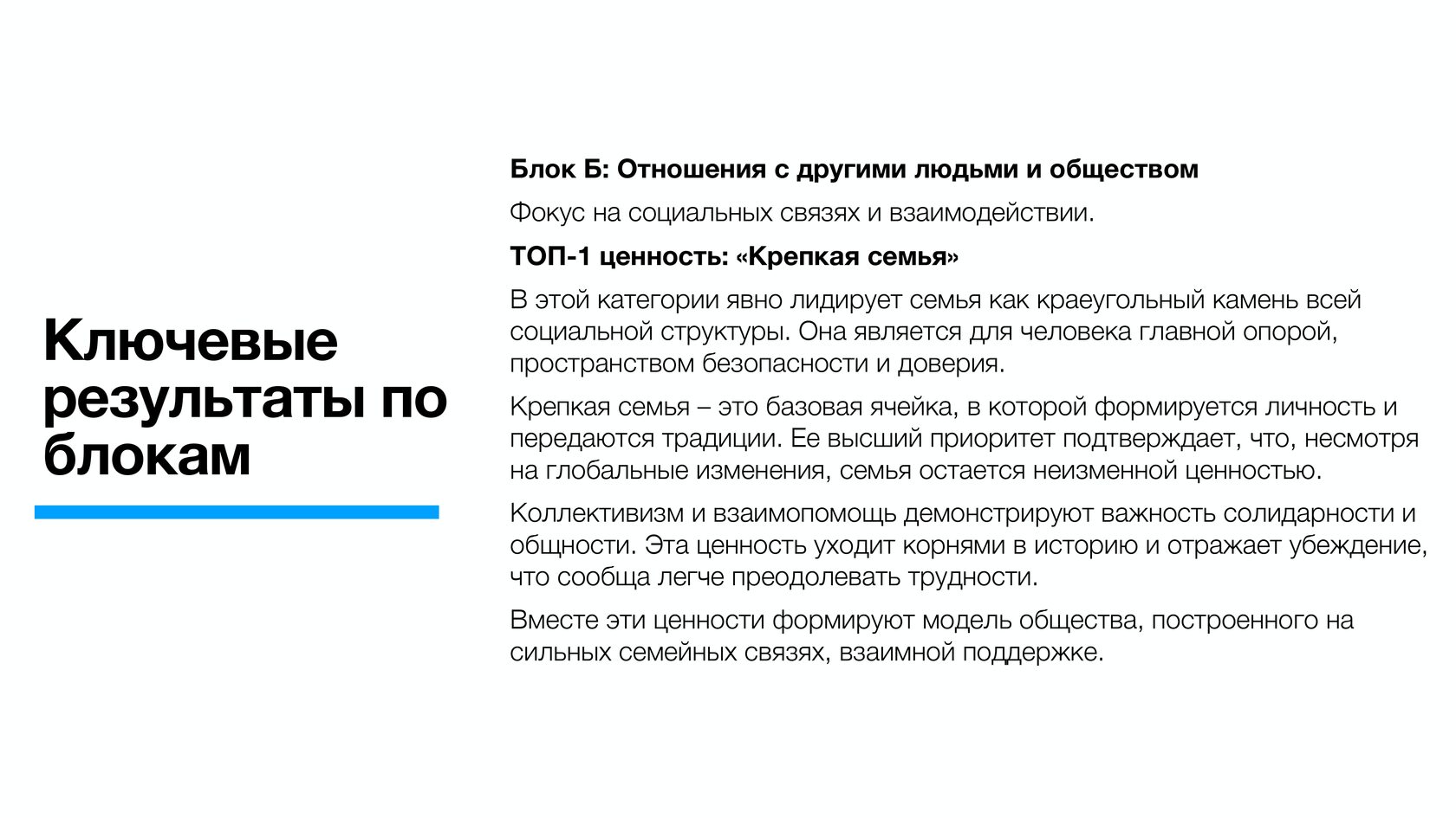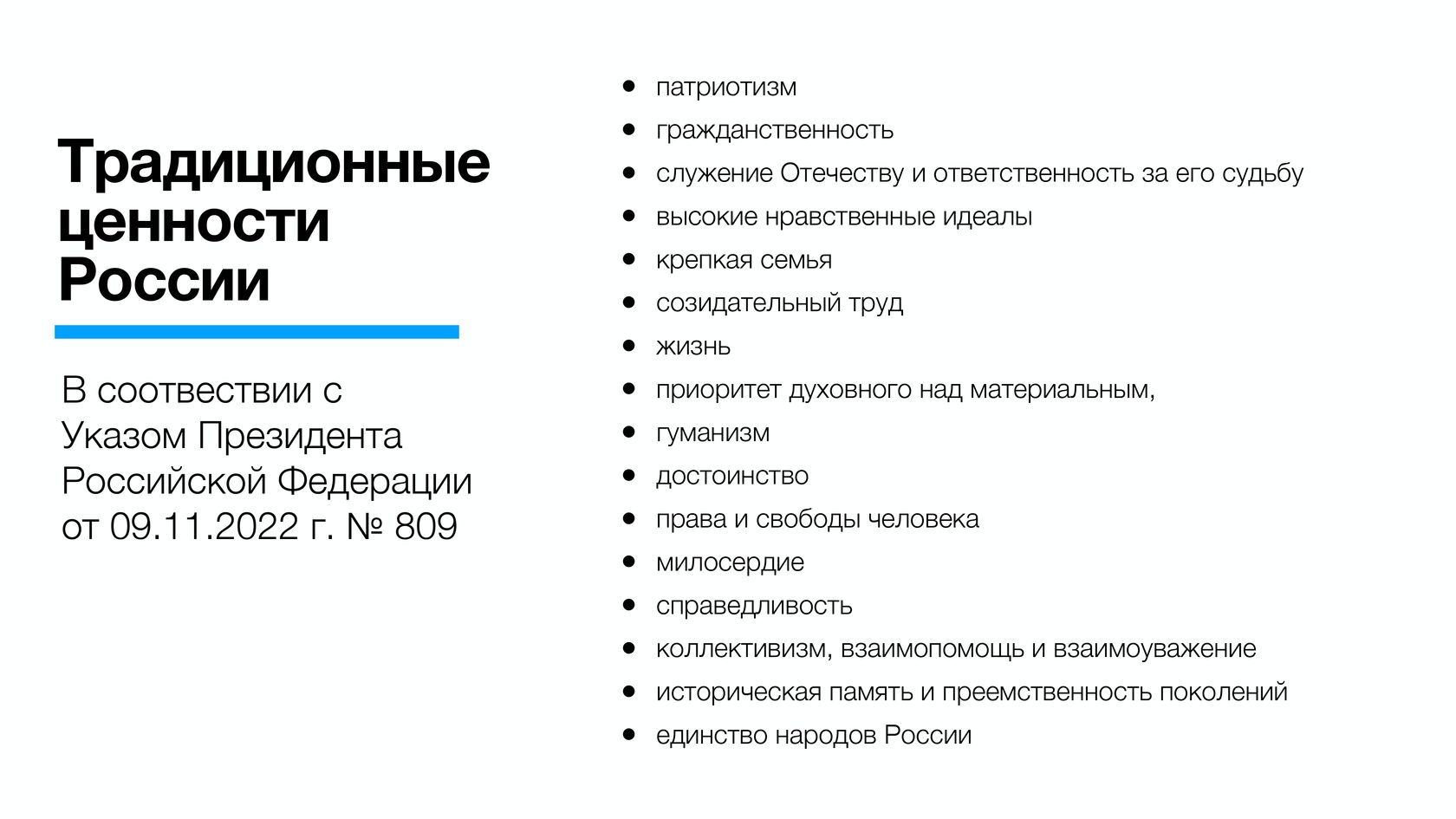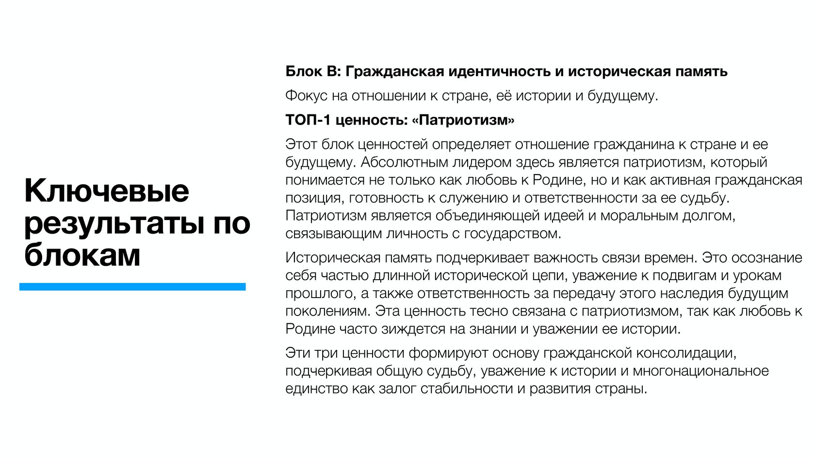 По данным опросов, патриотизм (31,4%) и крепкая семья (26,7%) являются наиболее важными ценностями для россиян. Кроме того, 19,5% видят основную ценность в приоритете духовного над материальным, 14,8% - в исторической памяти и преемственности поколений, 11,9% - в высоких нравственных идеалах.