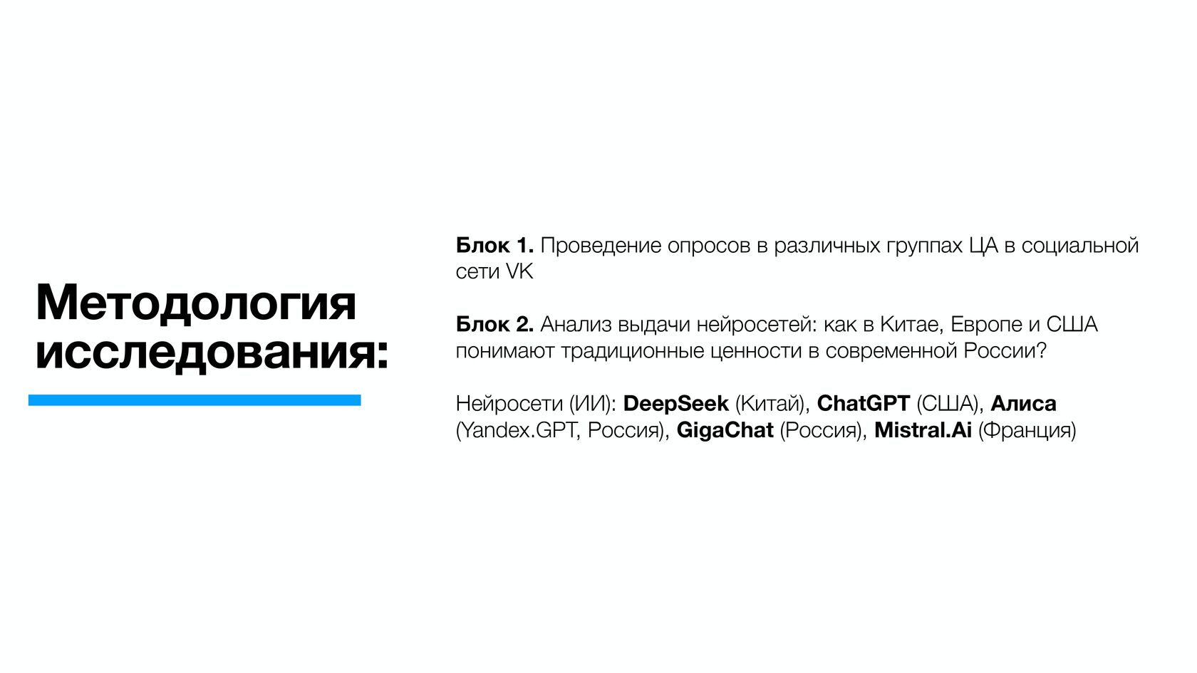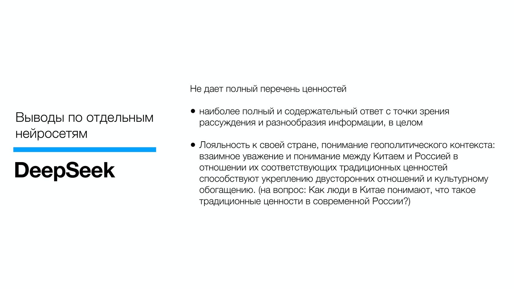 Кроме того, Российский фонд мира проанализировал восприятие российских традиционных ценностей через призму крупнейших нейросетей мира. Так, по версии DeepSeek (Китай) главными ценностями современной России являются семья и брак, патриотизм и гражданственность, духовность и нравственность.