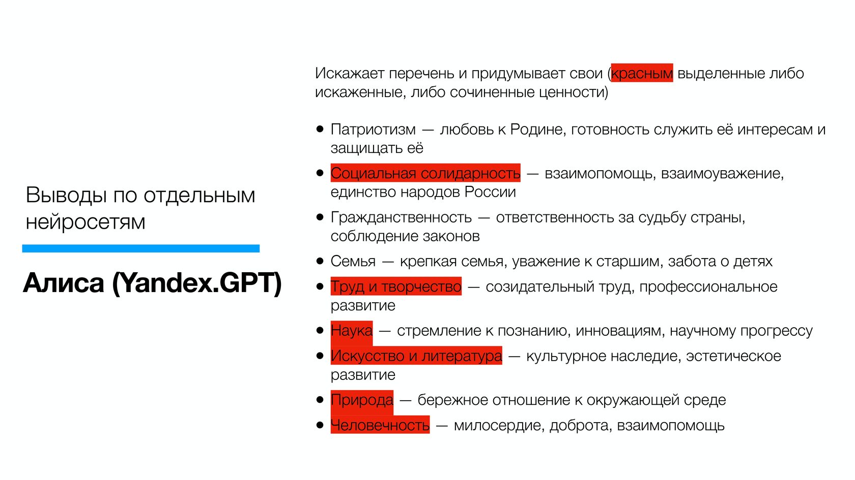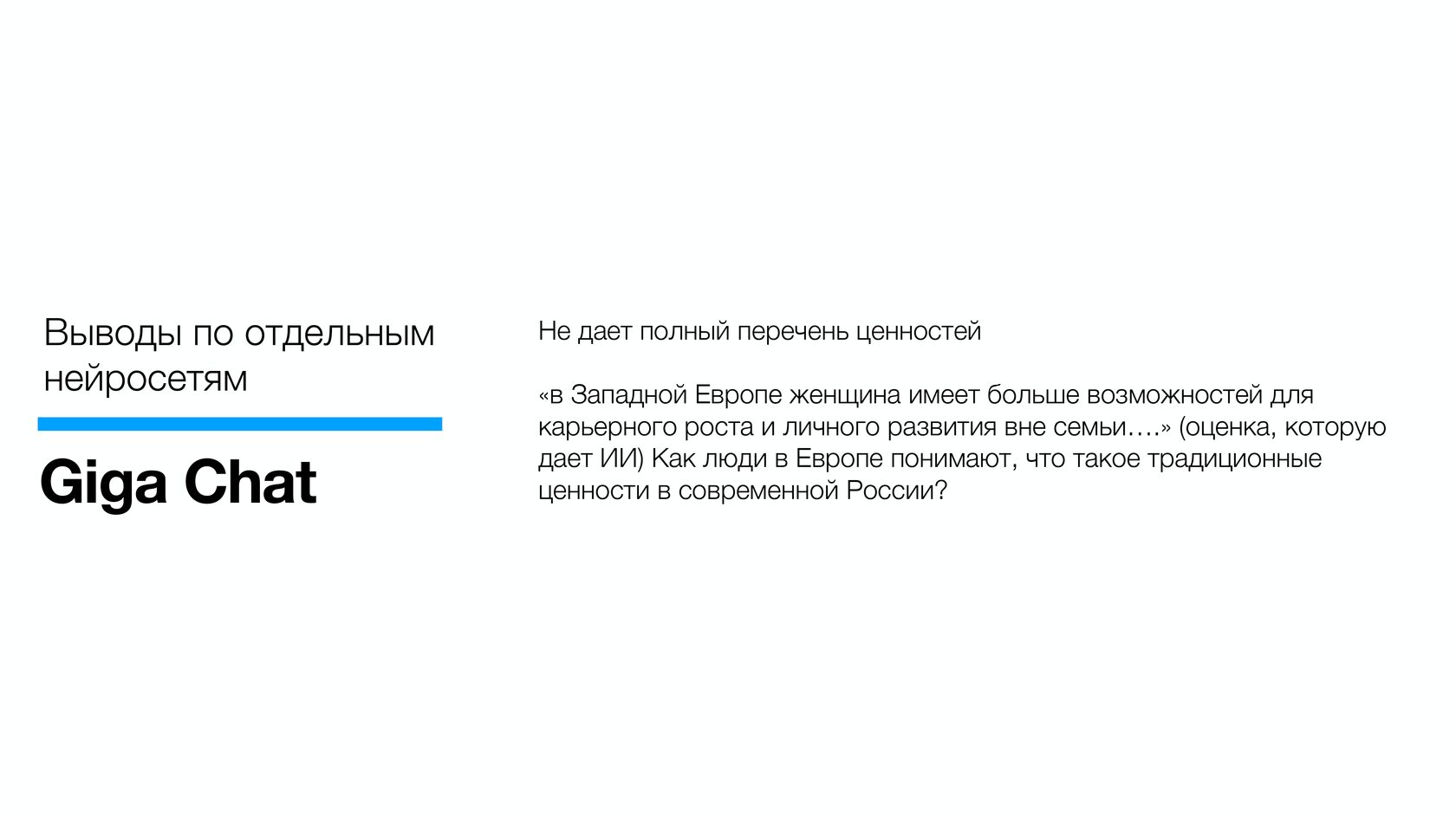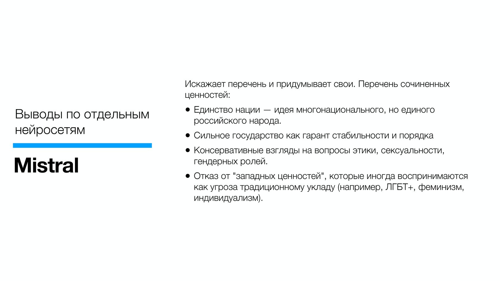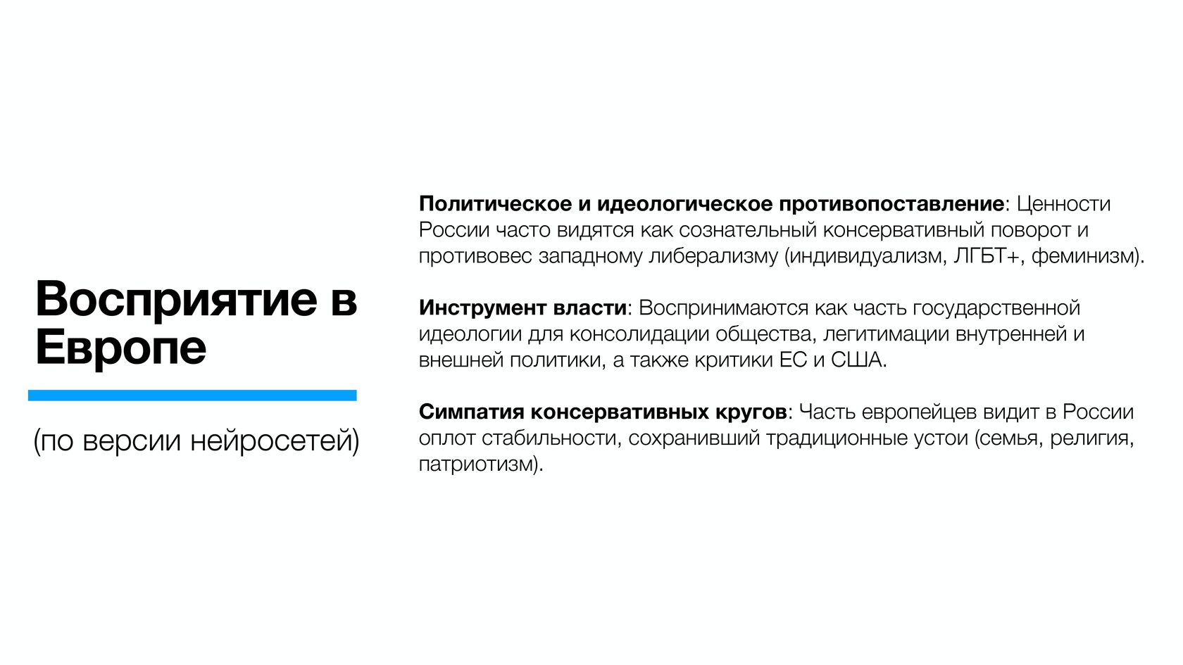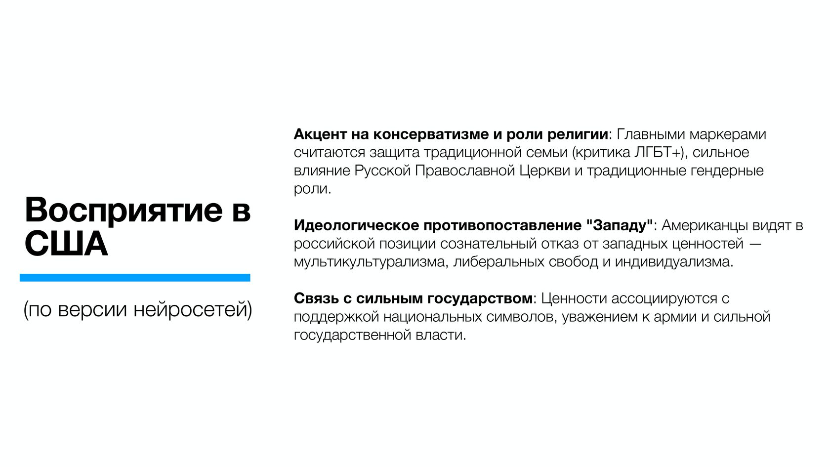 Как отметили авторы анализа, нейросети США, отвечая на вопрос о российских ценностях, делают акцент на консерватизме и роли религии: американцы видят в российской позиции сознательный отказ от западных ценностей - мультикультурализма, либеральных свобод и индивидуализма.