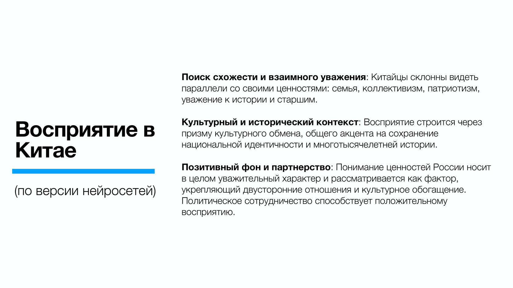 "Китайцы склонны видеть параллели со своими ценностями: семья, коллективизм, патриотизм, уважение к истории и старшим… Понимание ценностей России носит в целом уважительный характер и рассматривается как фактор, укрепляющий двусторонние отношения и культурное обогащение", - говорится в результатах анализа центра "Безопасность 2.0" Российского фонда мира.