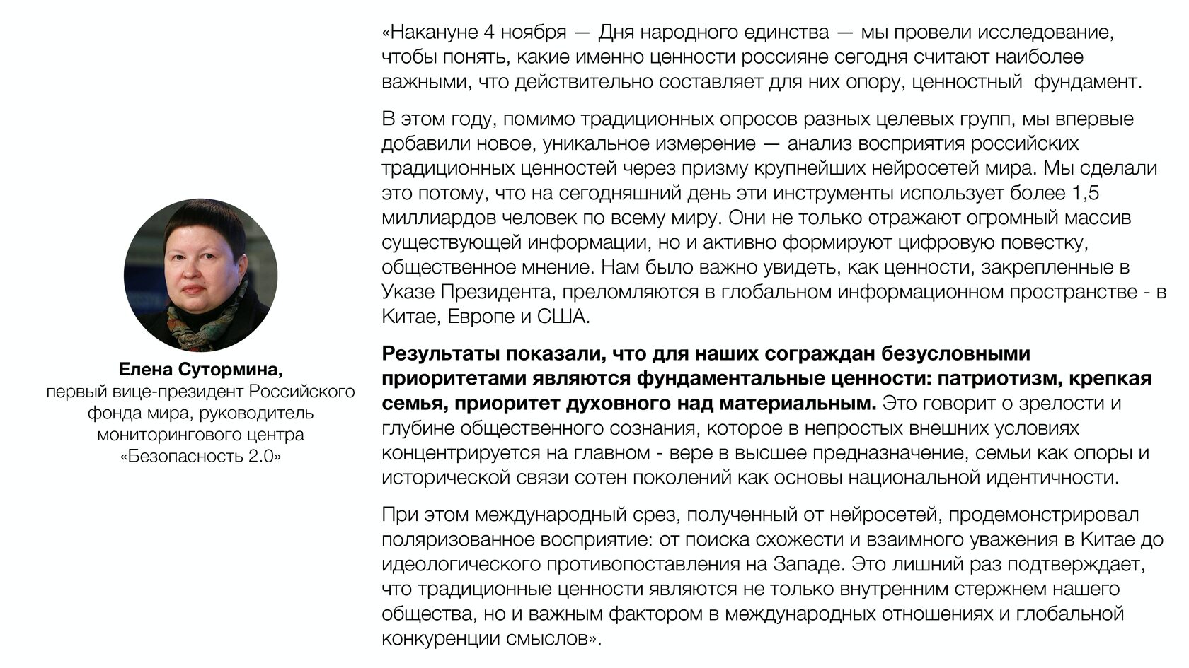 "Накануне 4 ноября - Дня народного единства - мы провели исследование, чтобы понять, какие именно ценности россияне сегодня считают наиболее важными, что действительно составляет для них опору, ценностный фундамент… Результаты показали, что для наших сограждан безусловными приоритетами являются фундаментальные ценности: патриотизм, крепкая семья, приоритет духовного над материальным", - отметила Сутормина.