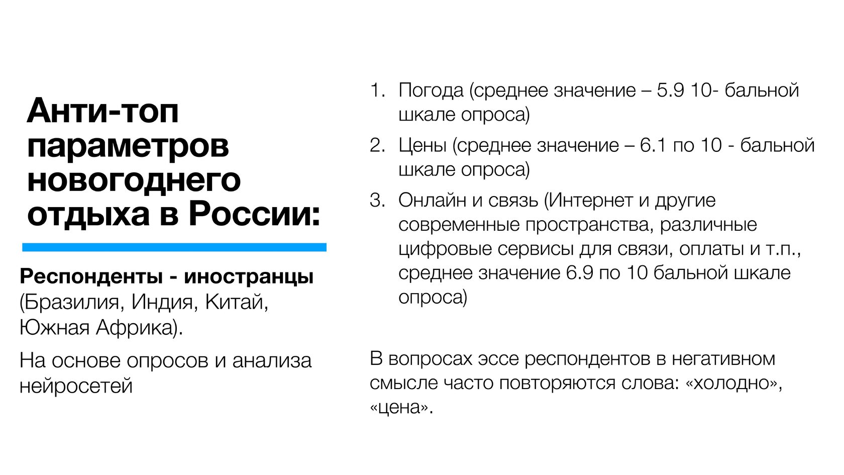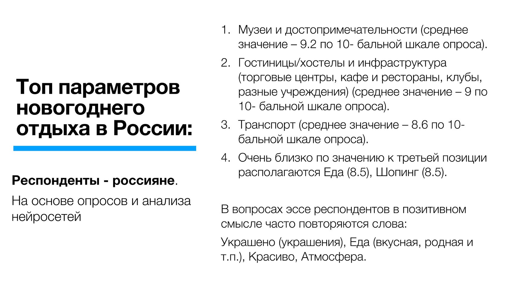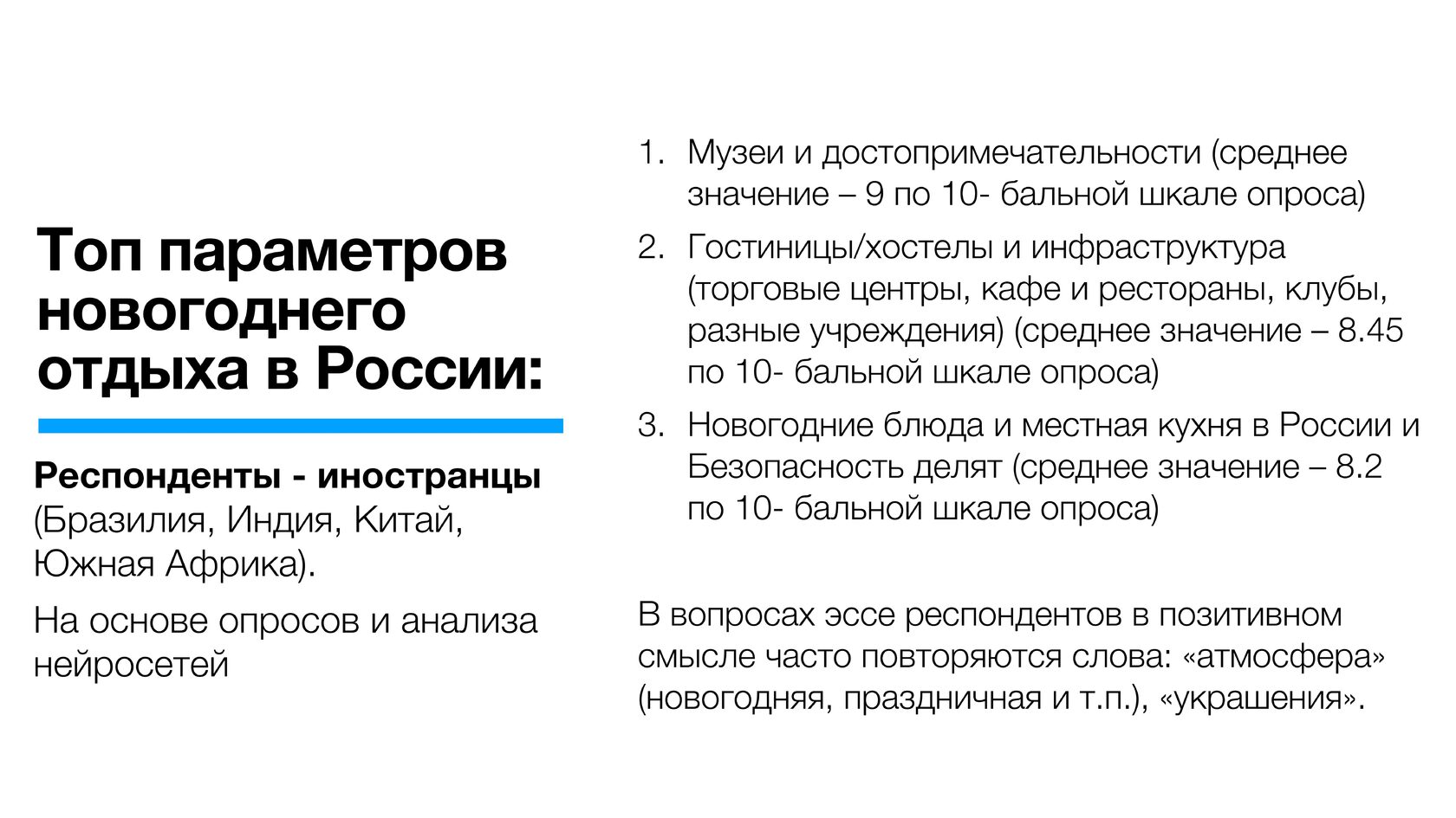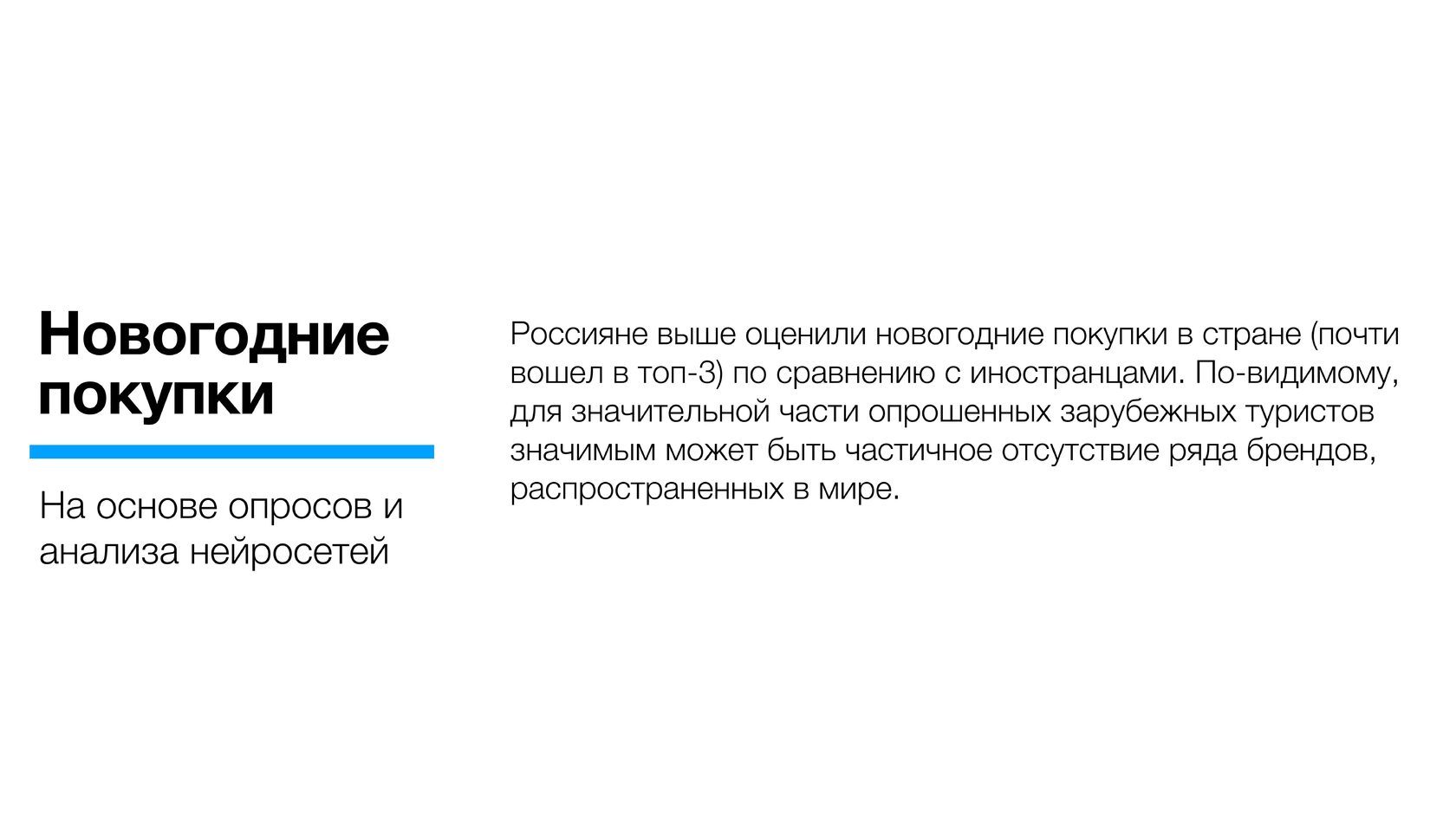 Россияне в целом выше оценили новогодние покупки в стране (почти вошли в топ-3 по позитивному отношению) по сравнению с иностранцами. По-видимому, для значительной части опрошенных зарубежных туристов значимым может быть частичное отсутствие ряда брендов, распространенных в мире.