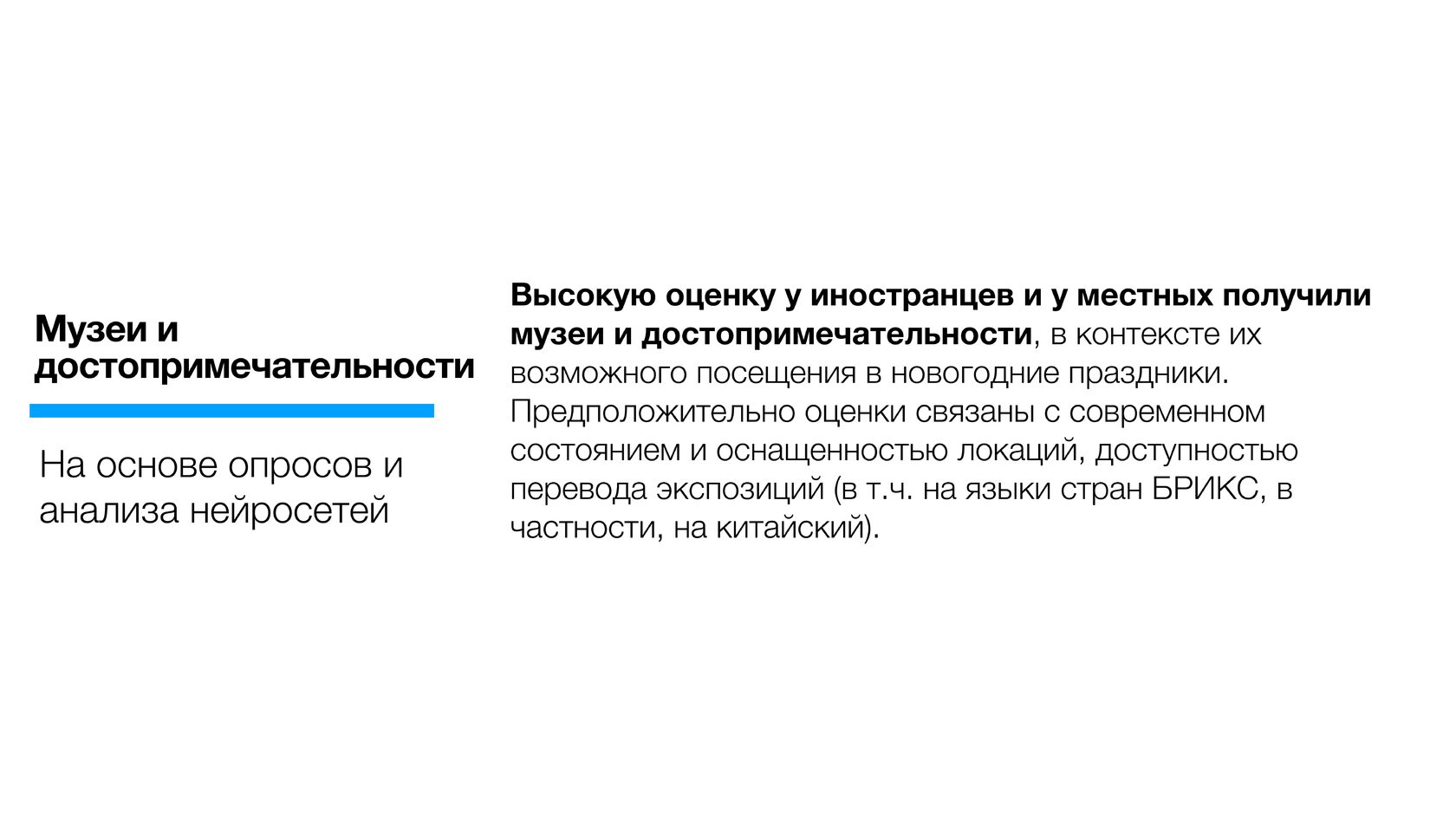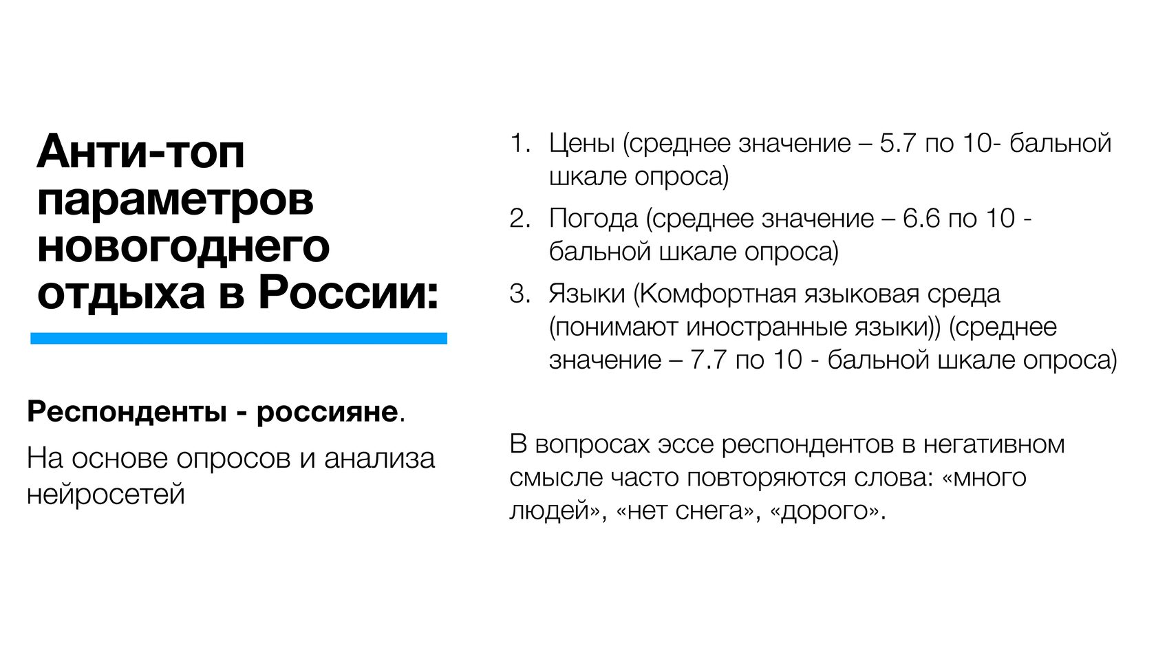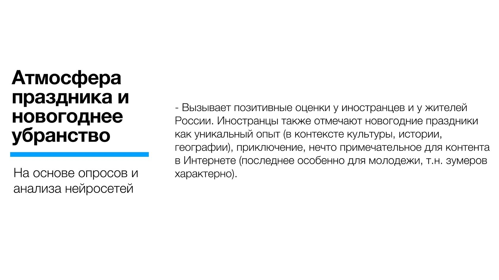 Россияне в целом выше оценили новогодние покупки в стране (почти вошли в топ-3 по позитивному отношению) по сравнению с иностранцами. По-видимому, для значительной части опрошенных зарубежных туристов значимым может быть частичное отсутствие ряда брендов, распространенных в мире.