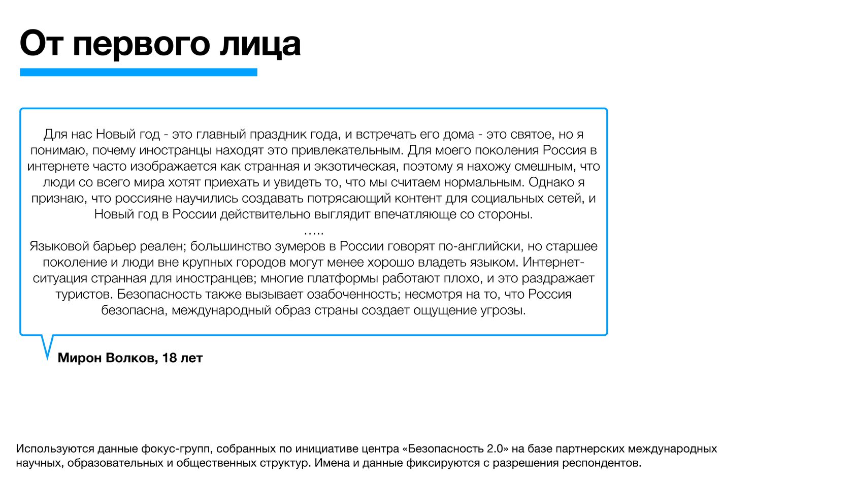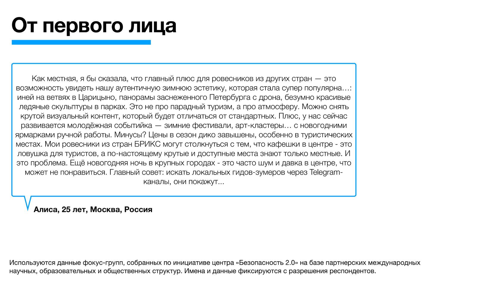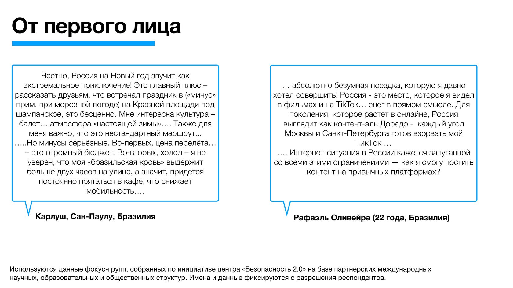 Используются данные фокус-групп, собранных по инициативе центра «Безопасность 2.0» на базе партнерских международных научных, образовательных и общественных структур. Имена и данные фиксируются с разрешения респондентов.