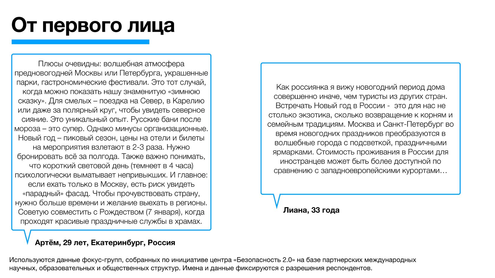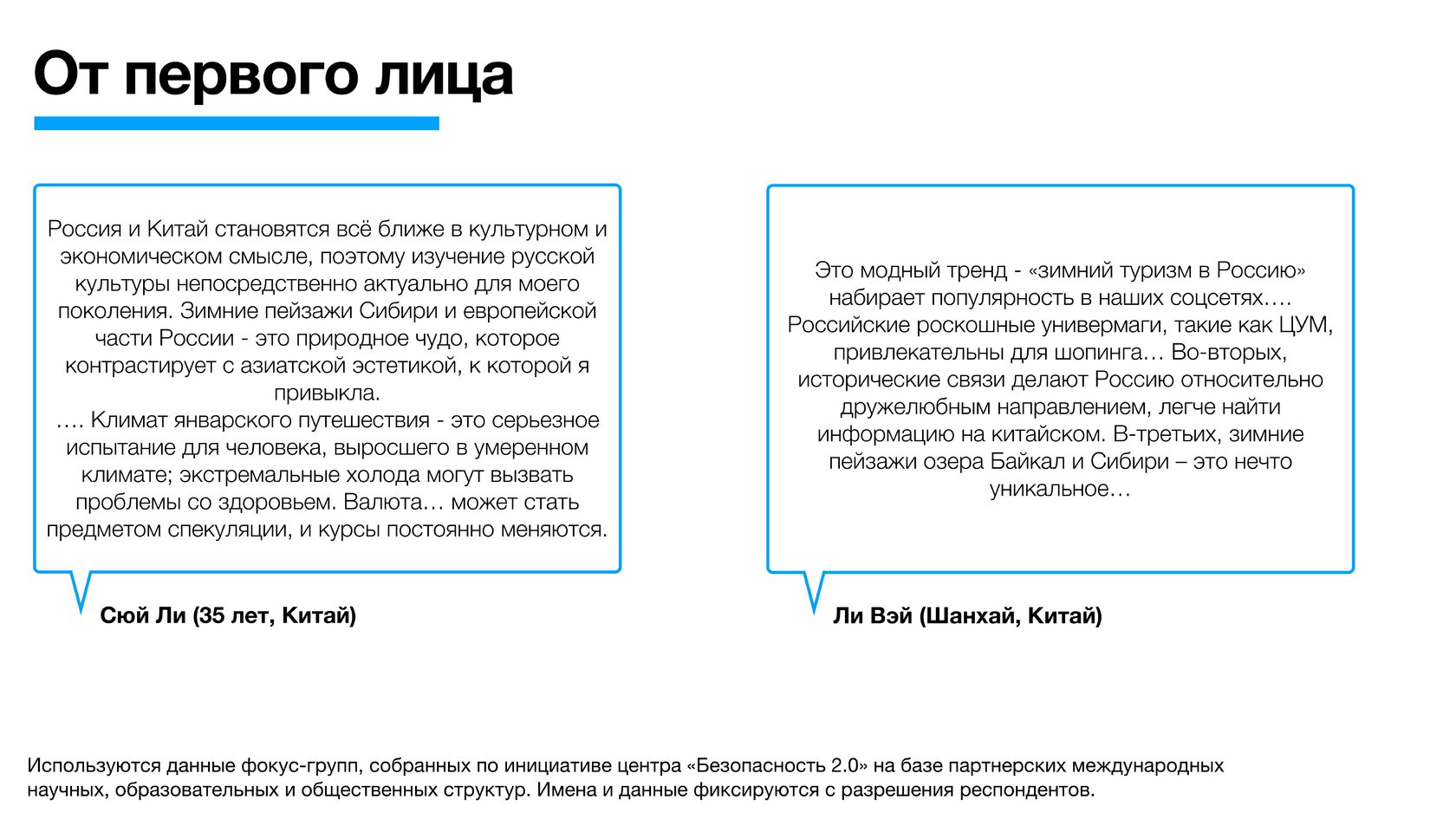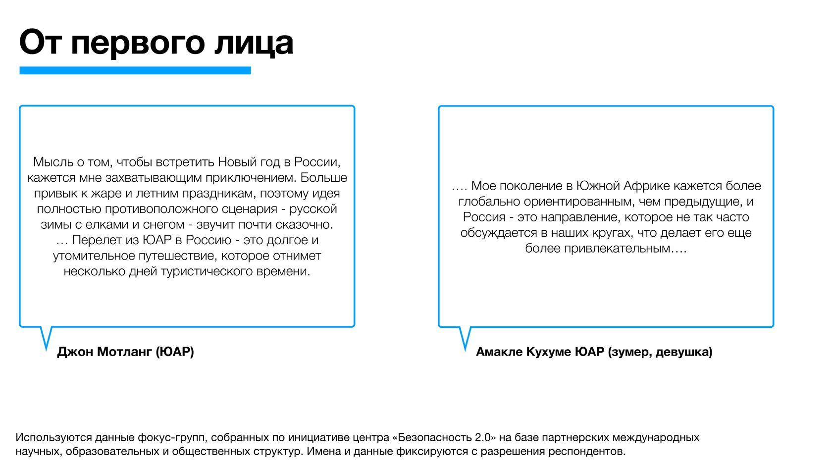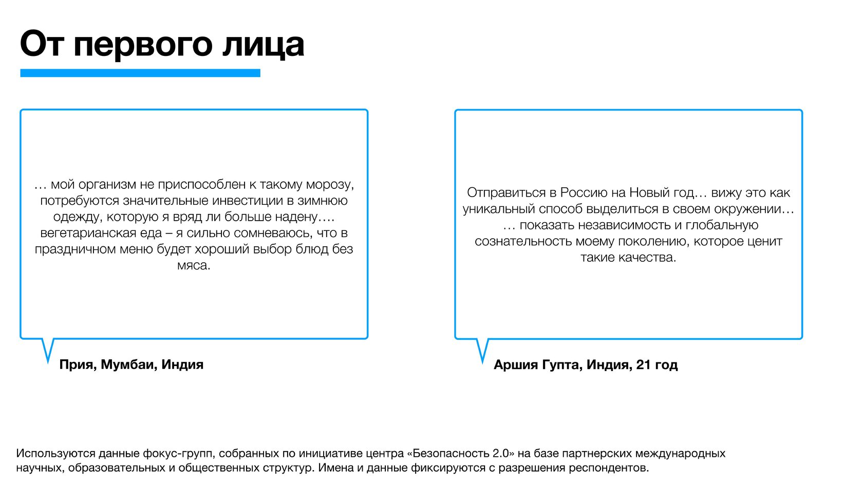 Используются данные фокус-групп, собранных по инициативе центра «Безопасность 2.0» на базе партнерских международных научных, образовательных и общественных структур. Имена и данные фиксируются с разрешения респондентов.
