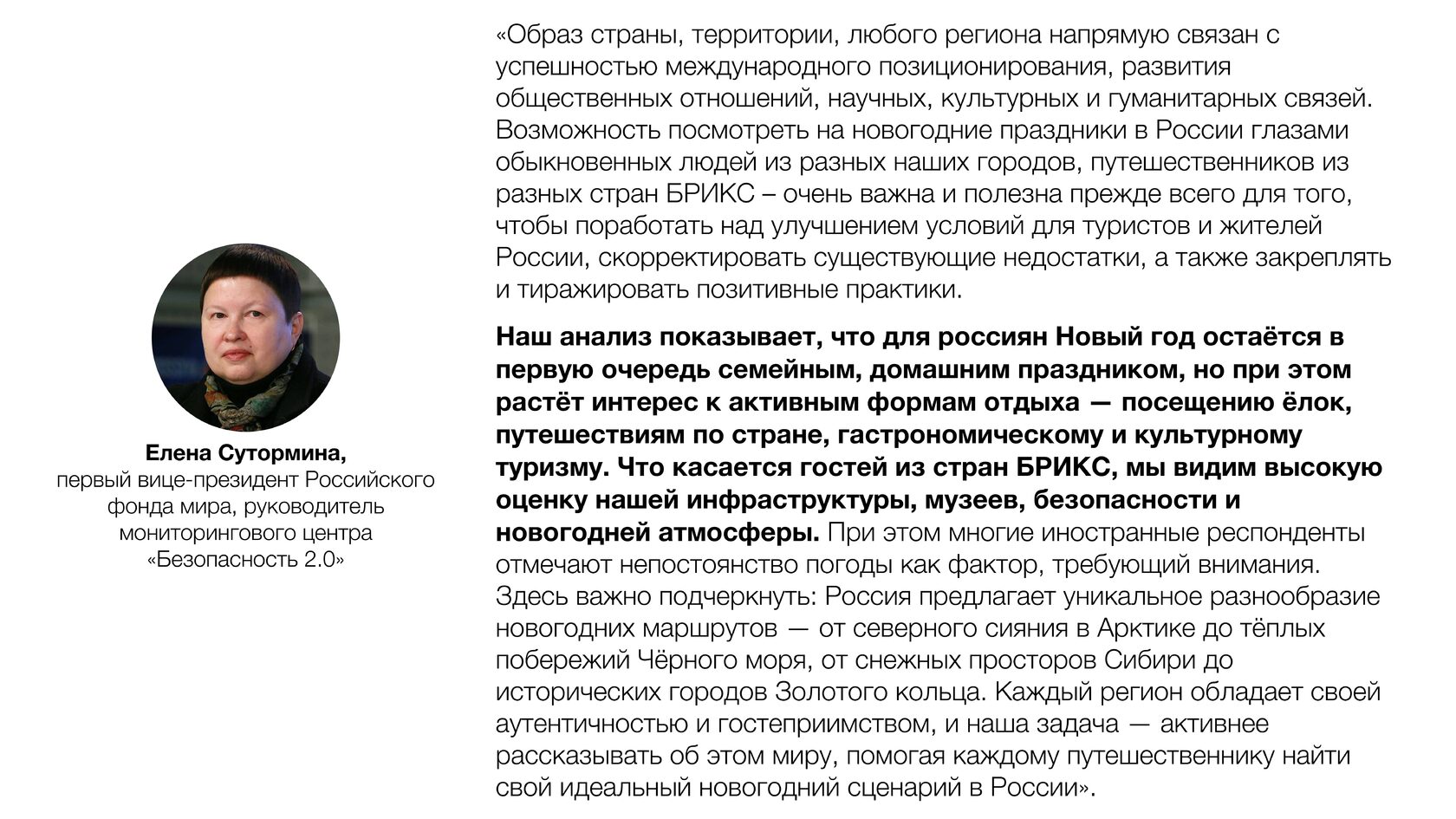 Это модный тренд - «зимний туризм в Россию» набирает популярность в наших соцсетях…. Российские роскошные универмаги, такие как ЦУМ, привлекательны для шопинга… Во-вторых, исторические связи делают Россию относительно дружелюбным направлением, легче найти информацию на китайском. В-третьих, зимние пейзажи озера Байкал и Сибири – это нечто уникальное…