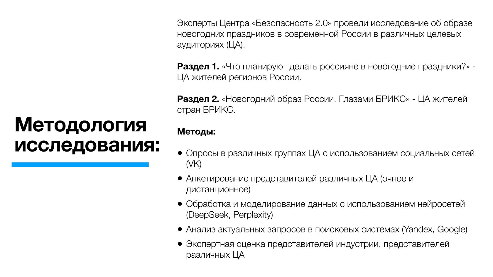 Эксперты Центра «Безопасность 2.0» провели исследование об образе новогодних праздников в современной России в различных целевых аудиториях (ЦА), используя анкетирование представителей различных ЦА (очное и дистанционное), опросы в социальных сетях (VK), анализ актуальных запросов в поисковых системах (Yandex, Google), экспертные оценки представителей индустрии, интервью представителей различных ЦА. Данные обрабатывались и моделировались с использованием генеративных и поисковых нейросетей (DeepSeek, Gigachat, Perplexity и другие).
