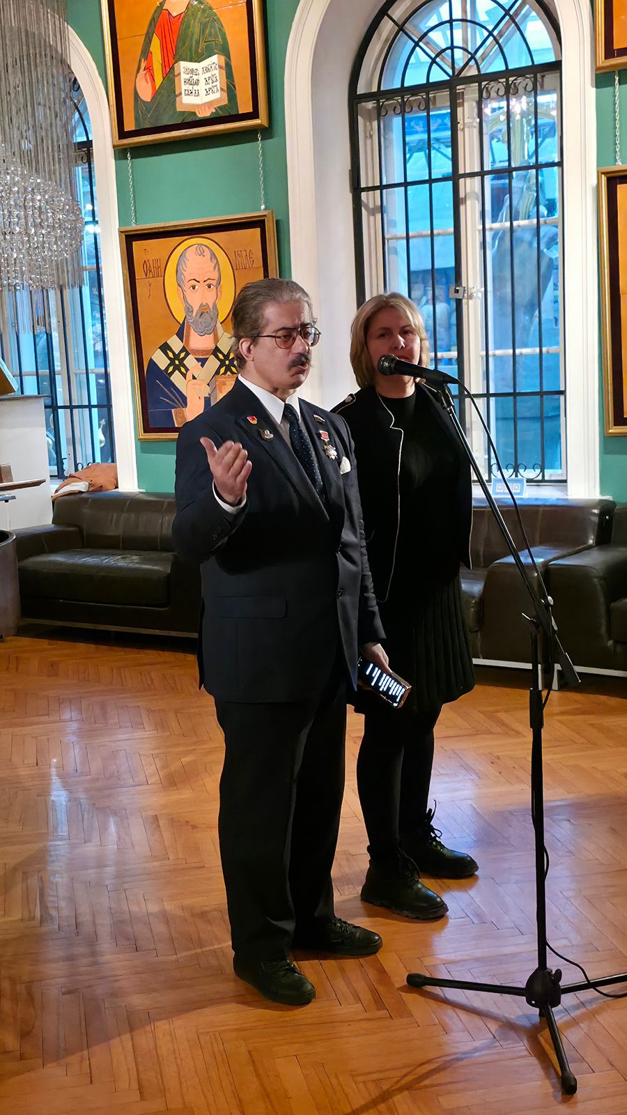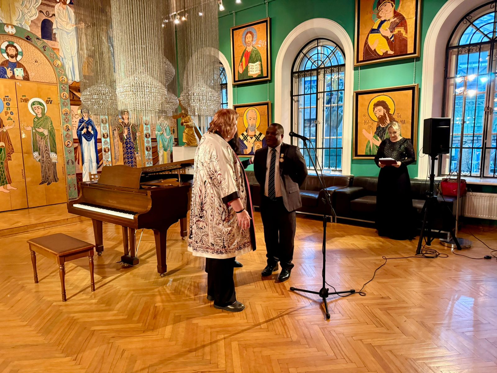 С приветственным словом выступили зарубежные гости Фонда: Военный атташе Посольства Республики Камерун в РФ г-н Самуэль-Педрито Биссионер Мбиле, Директор Фонда развития русско-китайских инвестиций «Один пояс один путь», Председатель Ассоциации Предпринимателей в сфере русско-китайского сотрудничества в сфере культуры и спорта г-н Ван Цюнь.