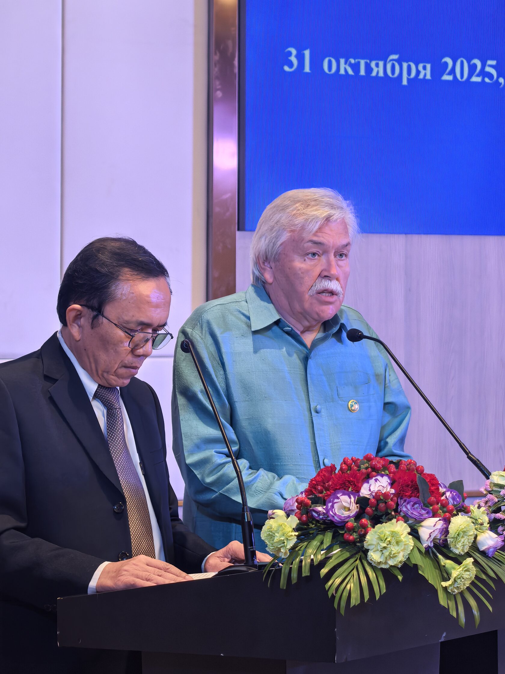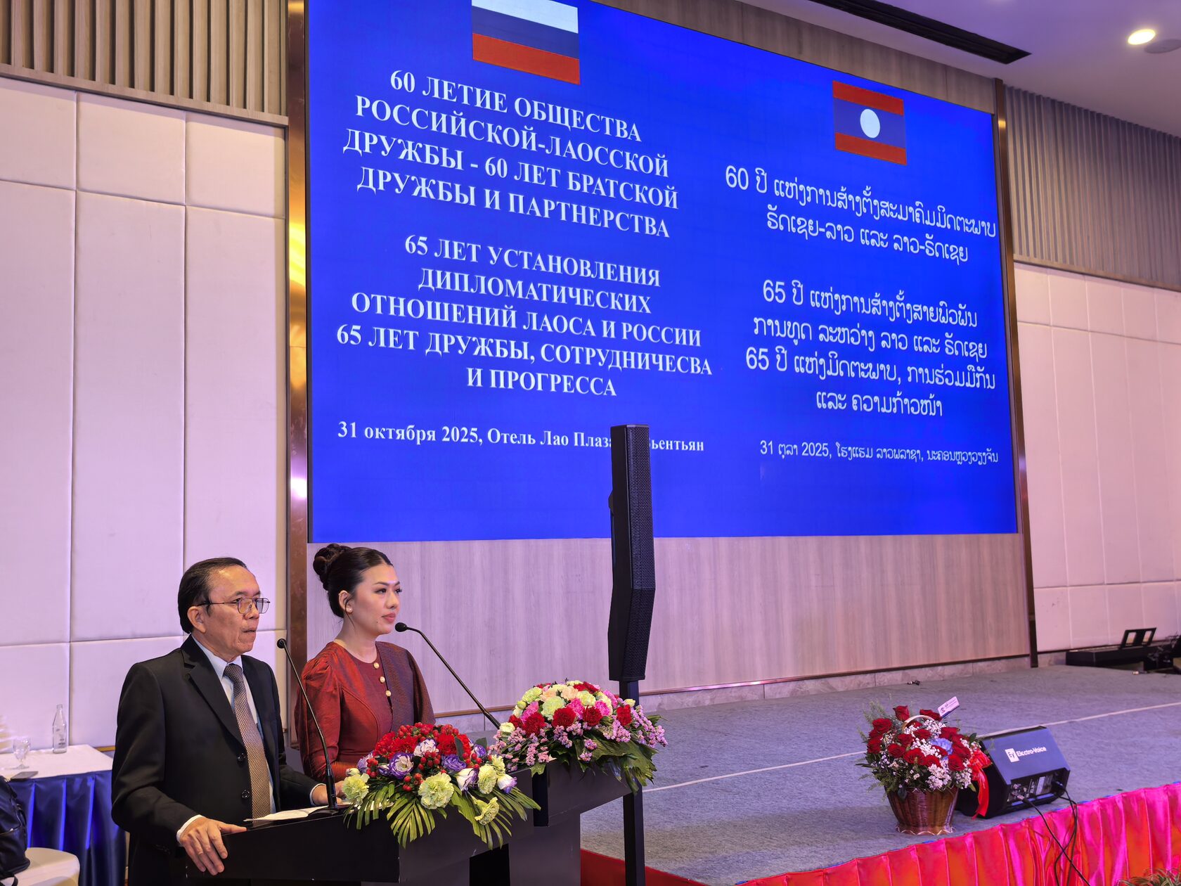 31 октября в столице Лаоса Вьентьяне в рамках визита делегации Общества Российско-Лаосской дружбы в Лаосскую Народную Демократическую Республику состоялась торжественная церемония, посвященная 65-летию установления дипломатических отношений между Россией и Лаосом и 60-летию основания Общества Лаосско-Российской Дружбы.