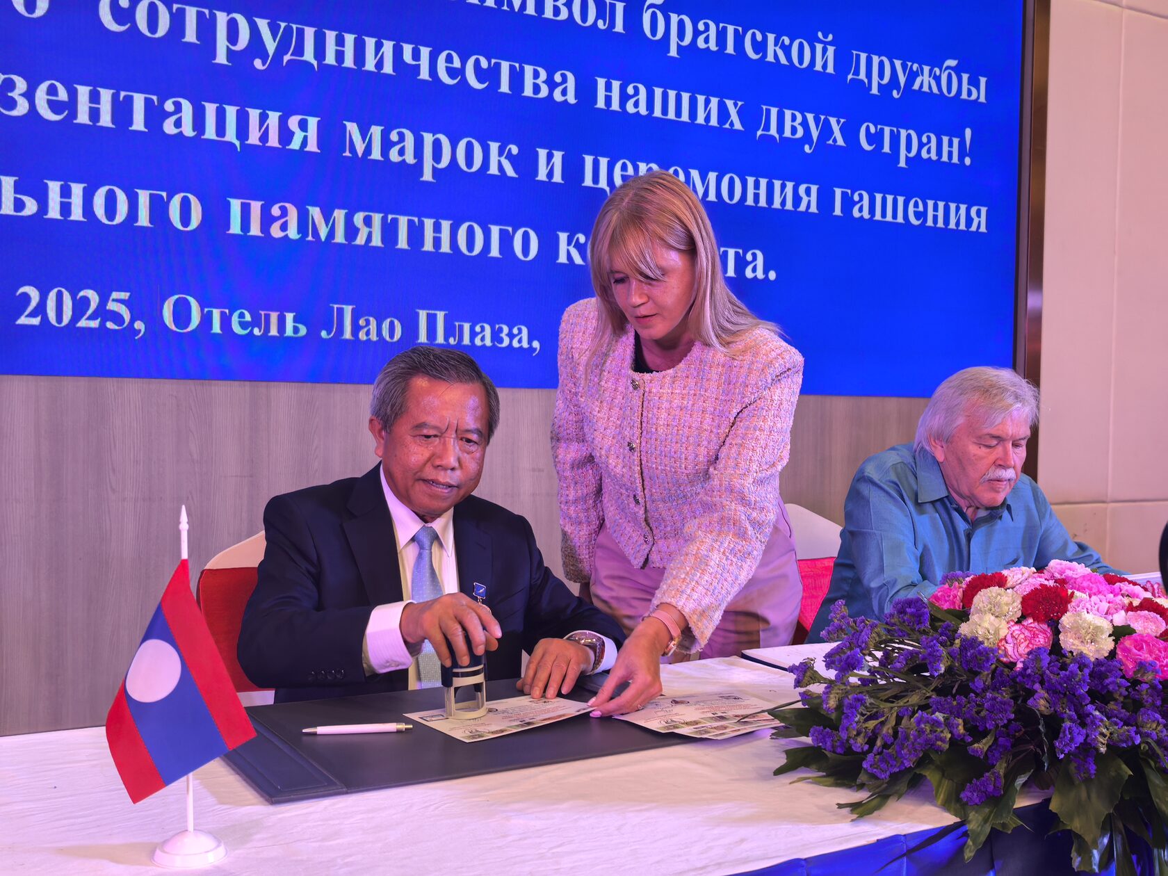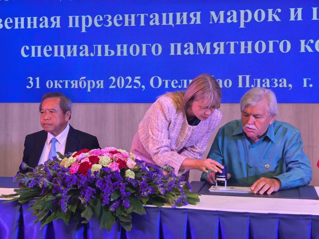 Торжественную часть мероприятия продолжила Презентация совместного выпуска почтовых марок «Фауна» России и Лаоса 2025 г. и церемония гашения специального памятного конверта.