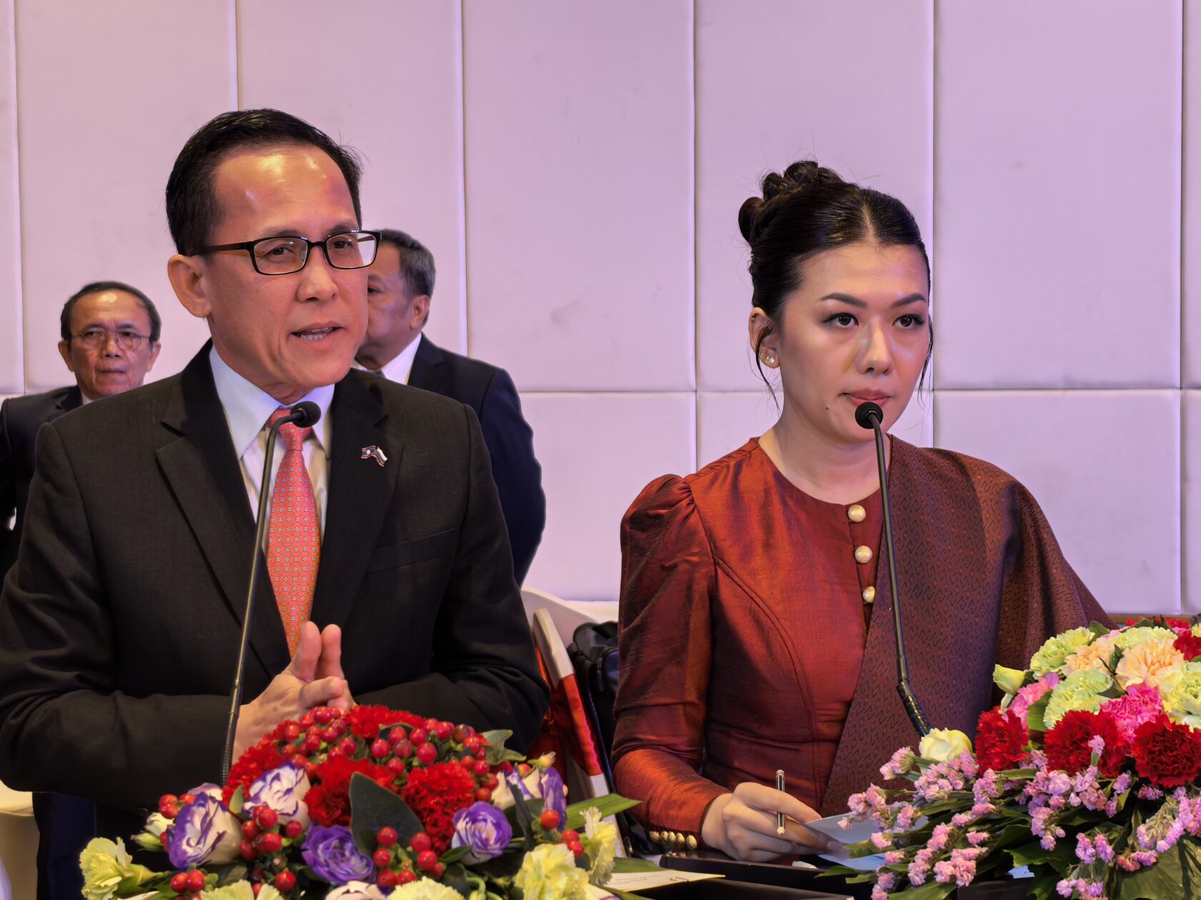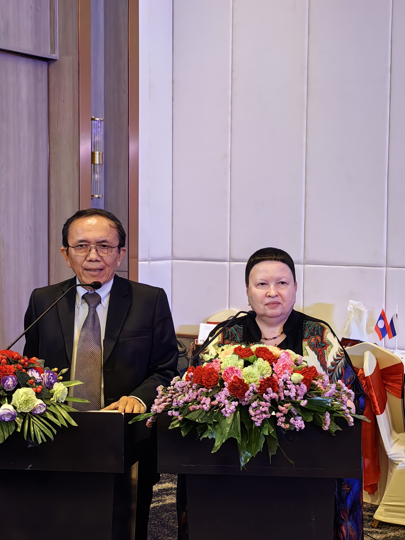 Первый заместитель Председателя Правления РФМ, заместитель Председателя Правления Общества Российско-Лаосской дружбы Е.Сутормина зачитала приветствие Председателя Правления РФМ, Председателя Комитета Государственной Думы РФ по международным делам Леонида Слуцого. В своем обращении к Министру иностранных дел Лаоса г-ну Тонгсовану Фомвингхану. онотметил, что за прошедшие десятилетия наши государства прошли плодотворный путь взаимодействия, основанный на принципах взаимного уважения, доверия и поддержки. Сегодня мы с уверенностью можем говорить о стратегическом характере нашего партнерства.