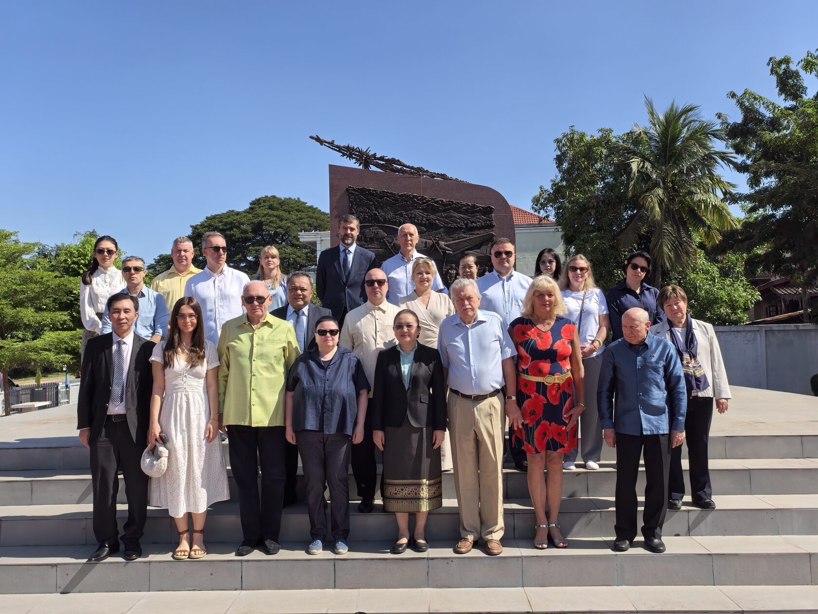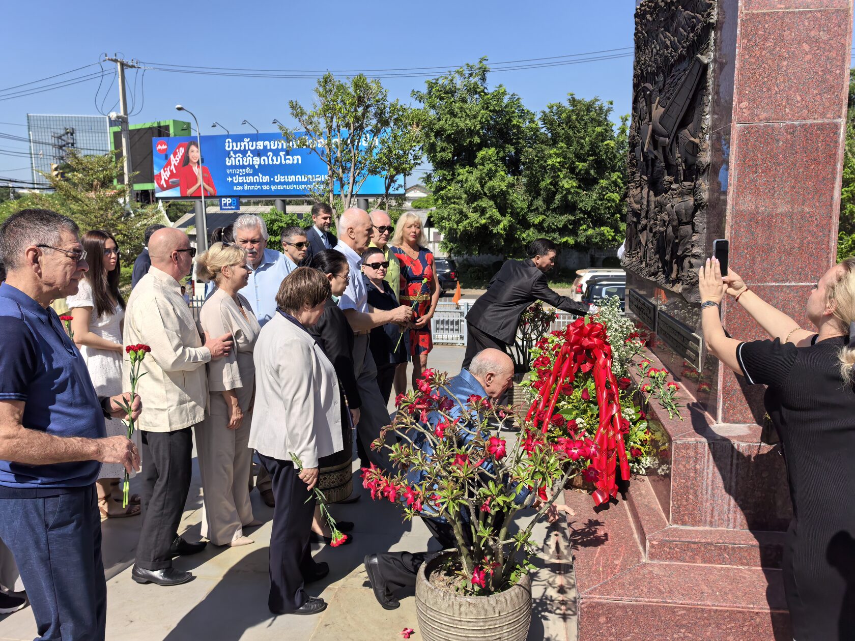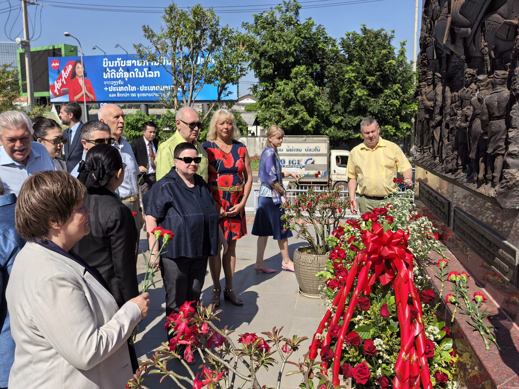 28 октября 2025г. в рамках визита, приуроченного к 65-летию установления дипломатических отношений между Россией и Лаосом и 60-летию Общества Лаосско-Российской дружбы, делегация Общества Лаосско-Российской дружбы с участием Первого заместителя Председателя Правления Общества Российско-Лаосского дружбы, заместителя Председателя Правления РФМ Игоря Панфилова, заместителя Председателя Правления Общества Российско-Лаосского дружбы, Первого заместителя Председателя Правления РФМ Елены Суторминой, приняла участие в торжественной церемонии возложения цветов в столице Лаоса Вьентьяне к памятнику советским военным летчикам, помогавшим народу Лаоса бороться за освобождение нации от угнетения империалистов, и отдавших свои жизни в Лаосе. Памятник был установлен в 2022г. по инициативе Общества Российско-Лаосского дружбы.