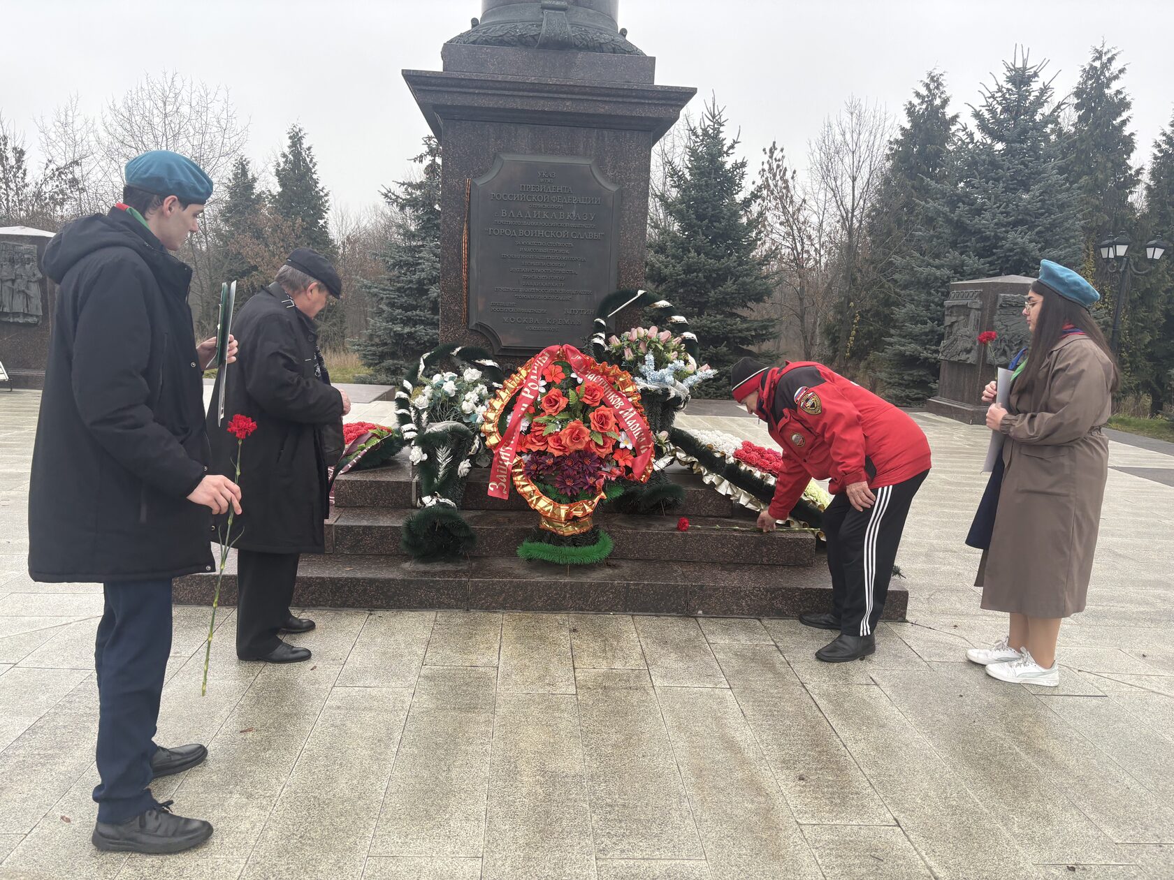 Алые гвоздики легли к монументу «Танк Т-34», Стеле «Город воинской Славы» Владикавказ, Плите Памяти, под которой священная земля из всех Городов-Героев Советского Союза соединена со священной землей Осетии, могиле И.А. Плиева. Активное участие в подготовке и проведении Марша Памяти приняли миротворцы из Школы №40 и Гимназии №16.