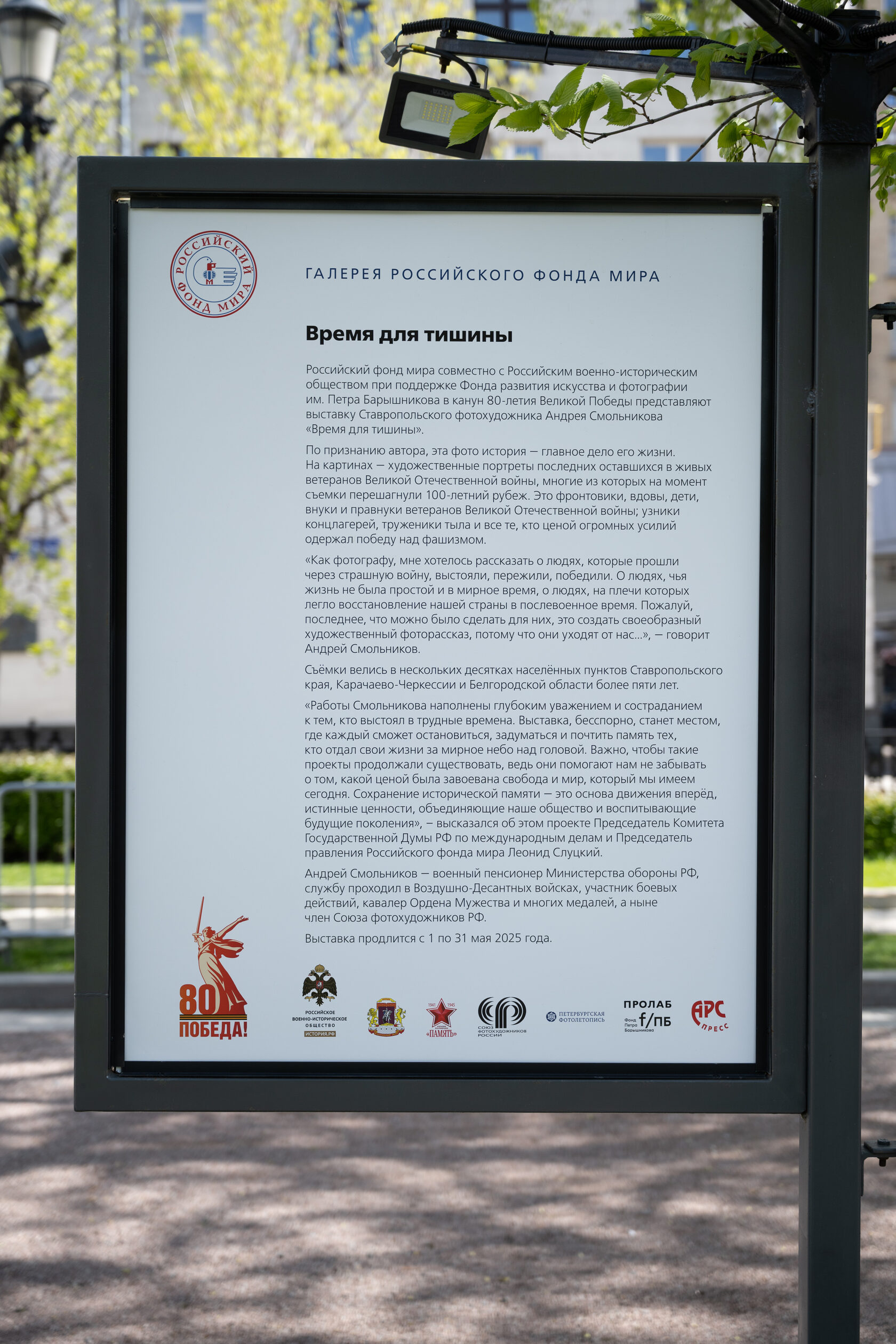 6 мая 2025г. на центральной аллее Тверского бульвара в Галерее Российского фонда мира в Москве открылась выставка фотохудожника Андрея Смольникова «Время для тишины», приуроченная к 80-летию Великой Победы. Представлена серия художественных портретов последних оставшихся в живых ветеранов Великой Отечественной войны, многие из которых на момент съемки перешагнули 100-летний рубеж. Это фронтовики, вдовы, узники концлагерей, труженики тыла и все те, кто ценой огромных усилий одержал Победу над фашизмом.