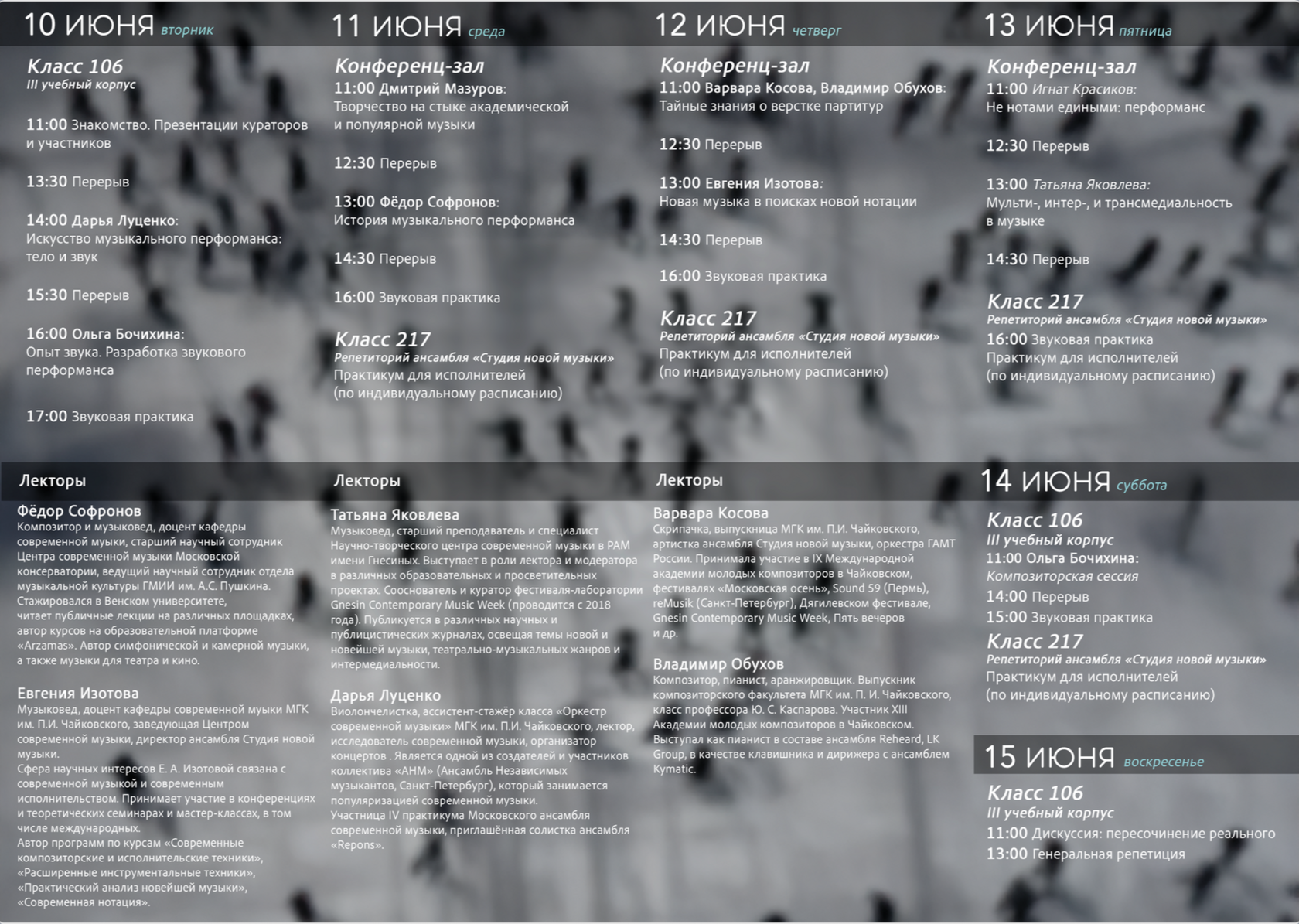 Исполнители приняли участие в мастер-классах, где под руководством солистов Студии новой музыки (пианистки Наталии Черкасовой, кларнетиста Игната Красикова, флейтистки Марины Рубинштейн, скрипачки Екатерины Фомицкой, вокалистки Екатерины Кичигиной) работали над классическими произведениями музыкального авангарда, в том числе и перформативными. На примере сочинений, написанных за последние десятилетия, участники познакомились с новыми композиторскими и исполнительскими техниками, с современной нотацией и с наиболее заметными тенденциями в композиторском творчестве.