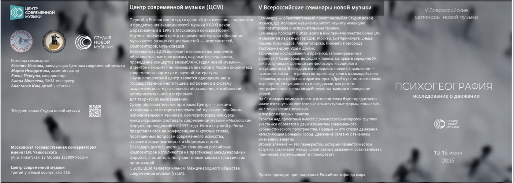 С 10 по 15 июня 2025г. ансамбль «Студия новой музыки» и Центр современной музыки Московской консерватории при поддержке Российского Фонда Мира в пятый раз провели Всероссийские семинары новой музыки в Московской консерватории им. П.И. Чайковского. Семинары проходили под общей темой «Психогеография: исследование о движении» и были организованы как лаборатория по созданию и реализации музыкального перформанса в сотрудничестве с режиссерско-актерской группой — выпускниками МИР-7 (Мастерской Индивидуальной Режиссуры Бориса Юхананова). В проекте участвовали молодые композиторы, исполнители и перформеры (актеры) из Москвы, Санкт-Петербурга, Казани, Нижнего Новгорода, Кемерово и Камчатского края. Куратором семинаров выступила Ольга Бочихина — композитор, доцент Московской консерватории.