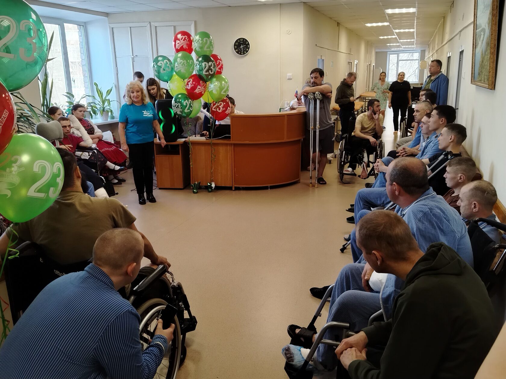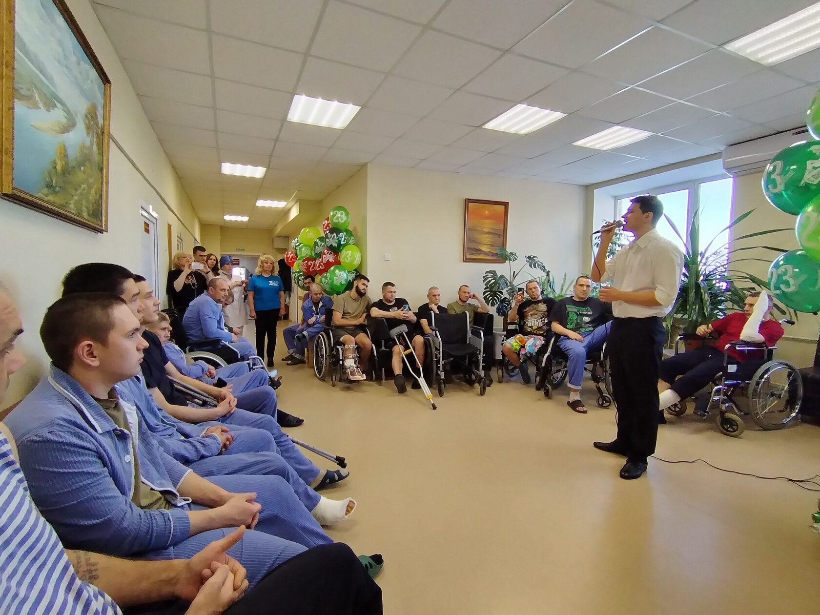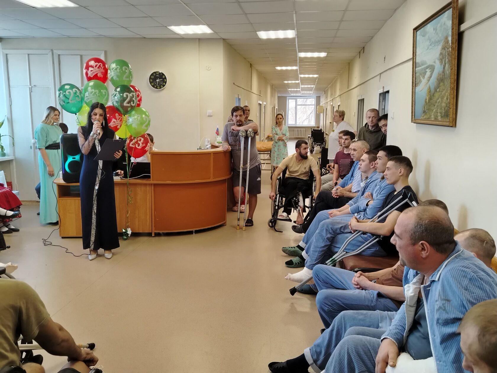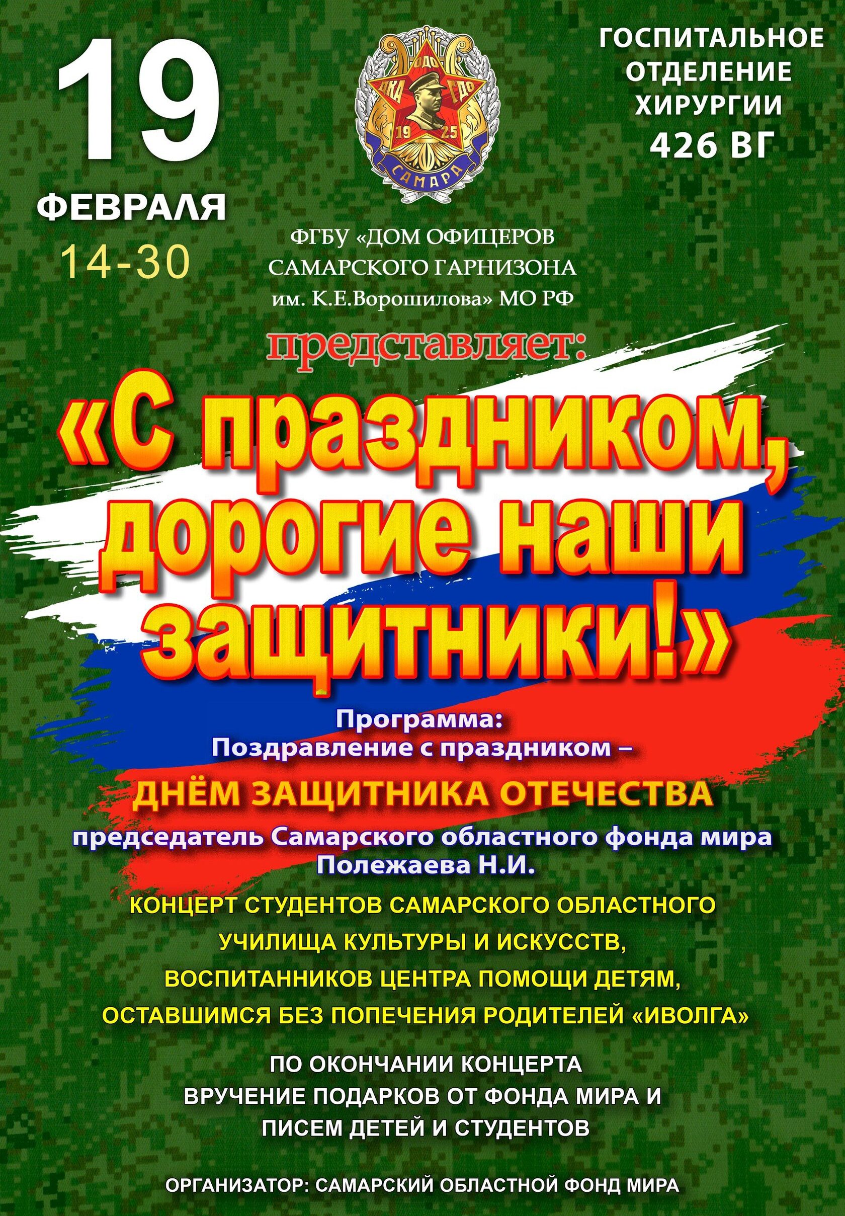 Член Правления Российского фонда мира, Председатель Самарского областного фонда мира Наталия Полежаева в завершении каждого концерта,обращаясь к военнослужащим, говорила: «Мы здесь, чтобы от Российского фонда мира, членом Правления которого я являюсь, Самарского фонда мира и жителей Самарской области передать вам благодарность, низкий поклон за возможность нам спокойно и мирно жить, работать и учиться и пожелать вам скорейшего выздоровления, удачи во всем, скорейшей Победы и сказать, что мы с вами! Взрослые жители, каждый как может, стараются поддержать наших защитников на передовой и находящихся на лечении: плетут маскировочные сети, собирают и отправляют посылки в зону СВО, молятся. Девушки и ребята приехали с концертом, чтобы выразить свою благодарность и поддержку участникам СВО. Даже маленькие дети, едва научившись писать, направляют письма поддержки. Поэтому победить нас невозможно и, как написано на футболках от Фонда мира, «Победа будет за нами!». Было видно, что раненым бойцам очень приятно в такой праздник вдали от своих родных и близких услышать слова благодарности и поддержки и получить подарки. До позднего вечера участники концертов ходили по палатам госпиталя с поздравлениями и подарками. В некоторых палатах для поднятия настроения тяжело раненым бойцам студенты исполняли песни.